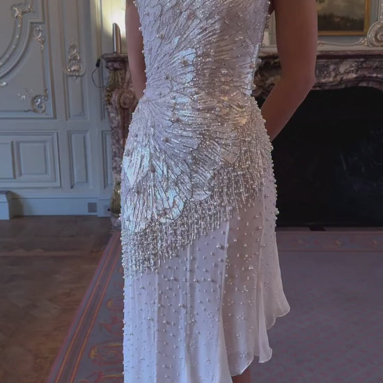 A strapless mini evening dress designed to capture attention with its luxurious craftsmanship. The dress is fully embellished with shimmering sequins and delicate beadwork, arranged in elegant, flowing patterns that enhance the silhouette.