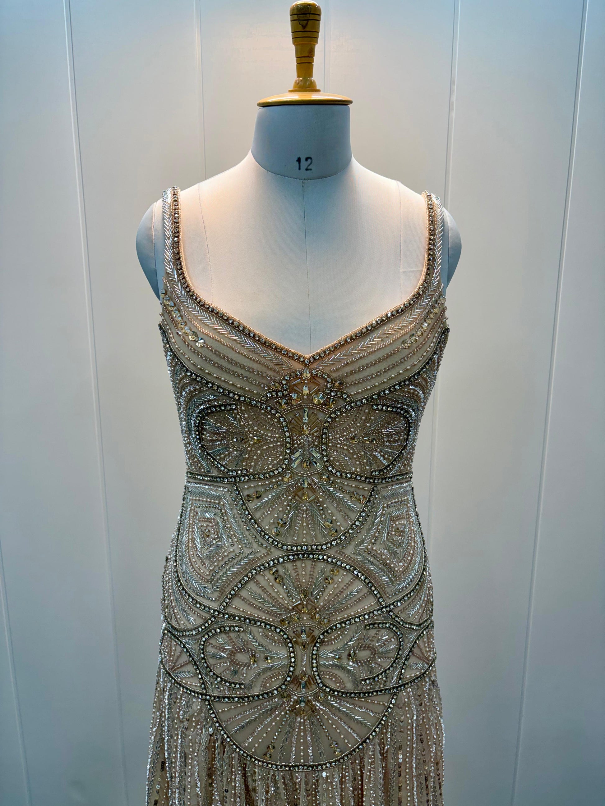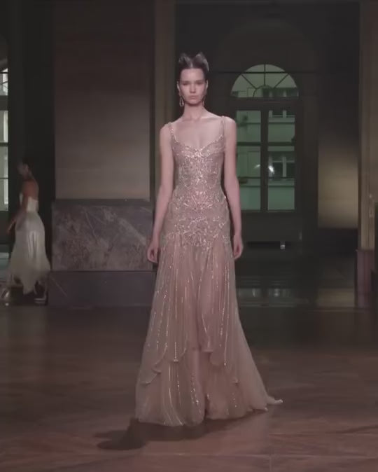 This stunning gown features a luxurious gold color and is adorned with intricate, symmetrical beadwork that reflects the elegance of the Art Deco era. It has delicate, beaded spaghetti straps and a fitted bodice that gracefully enhances the silhouette, flowing into a soft, sheer skirt embellished with shimmering lines of sequins and crystals. The refined geometric embroidery gives the dress a timeless, classic charm, making it perfect for red carpet events, lavish soirées, or elegant evening occasions.