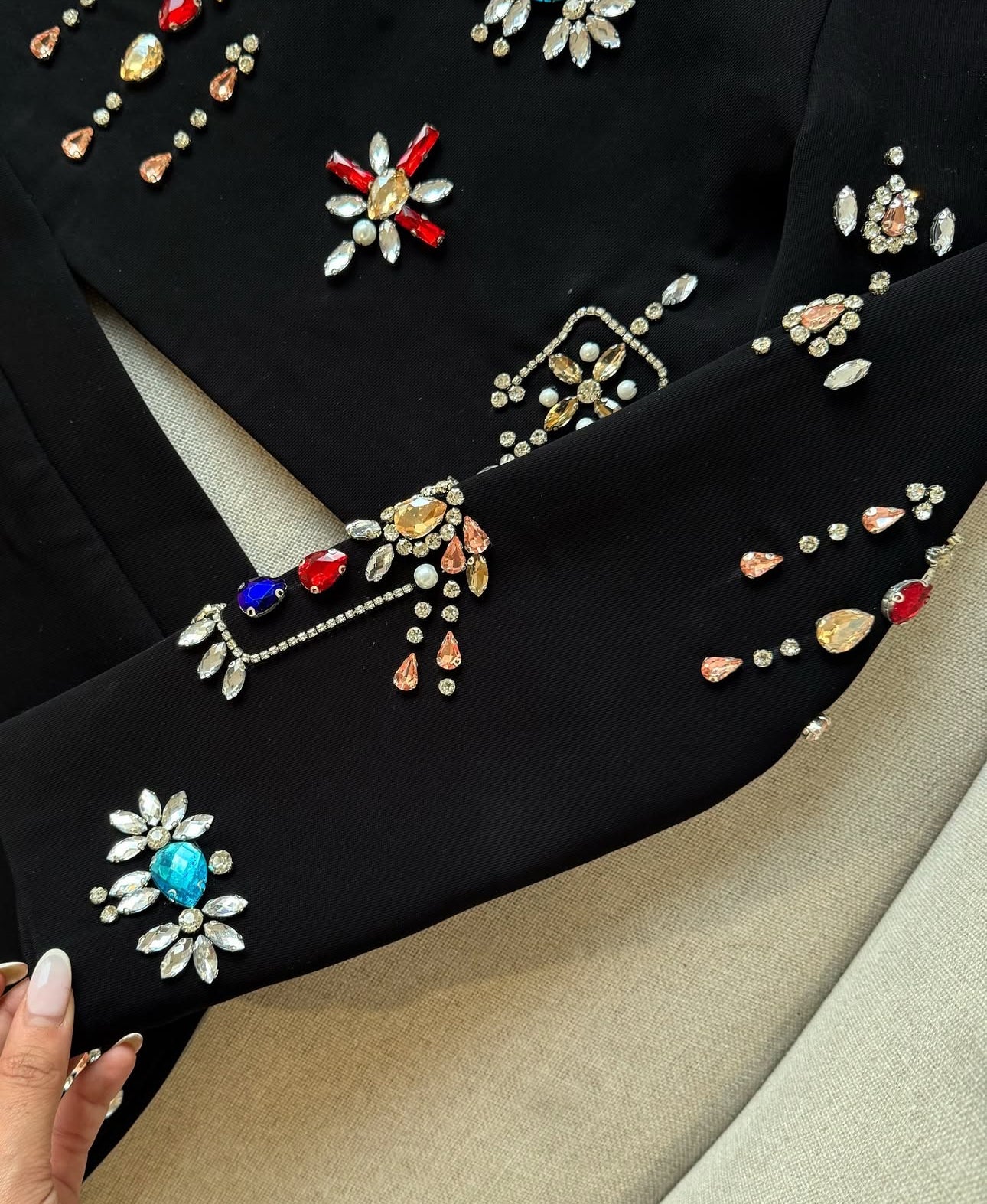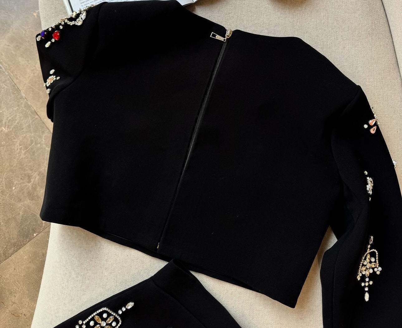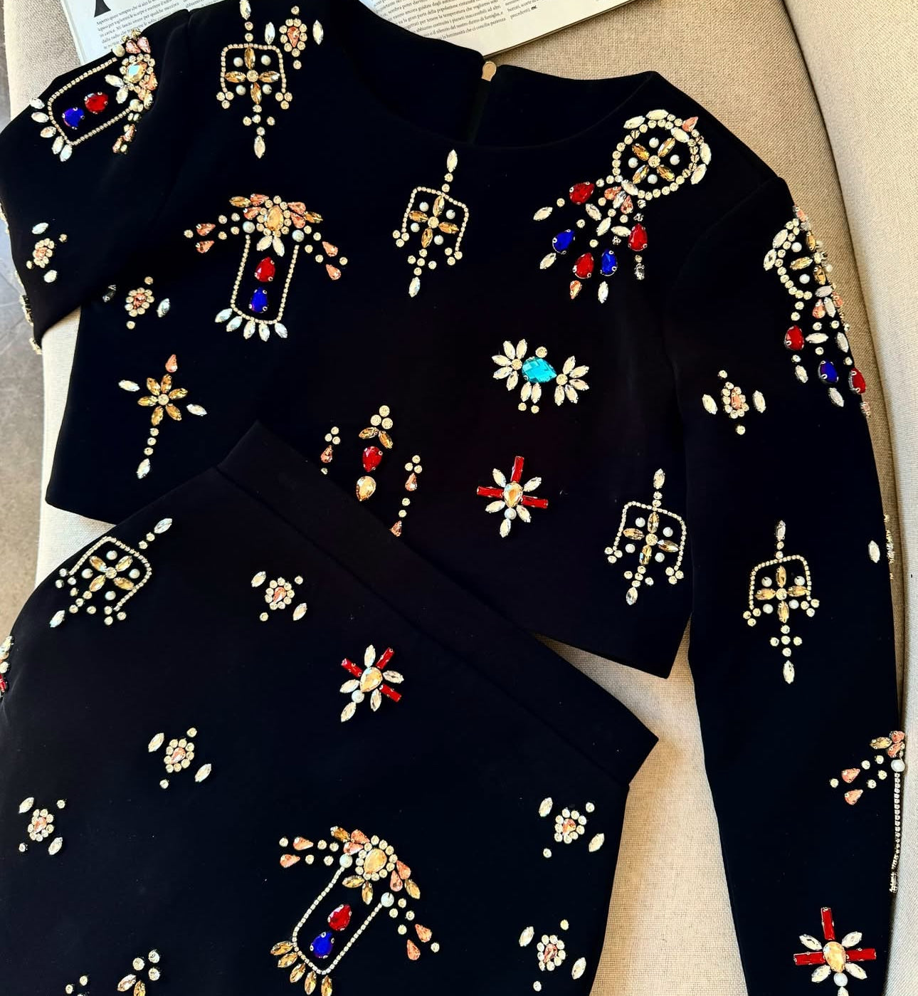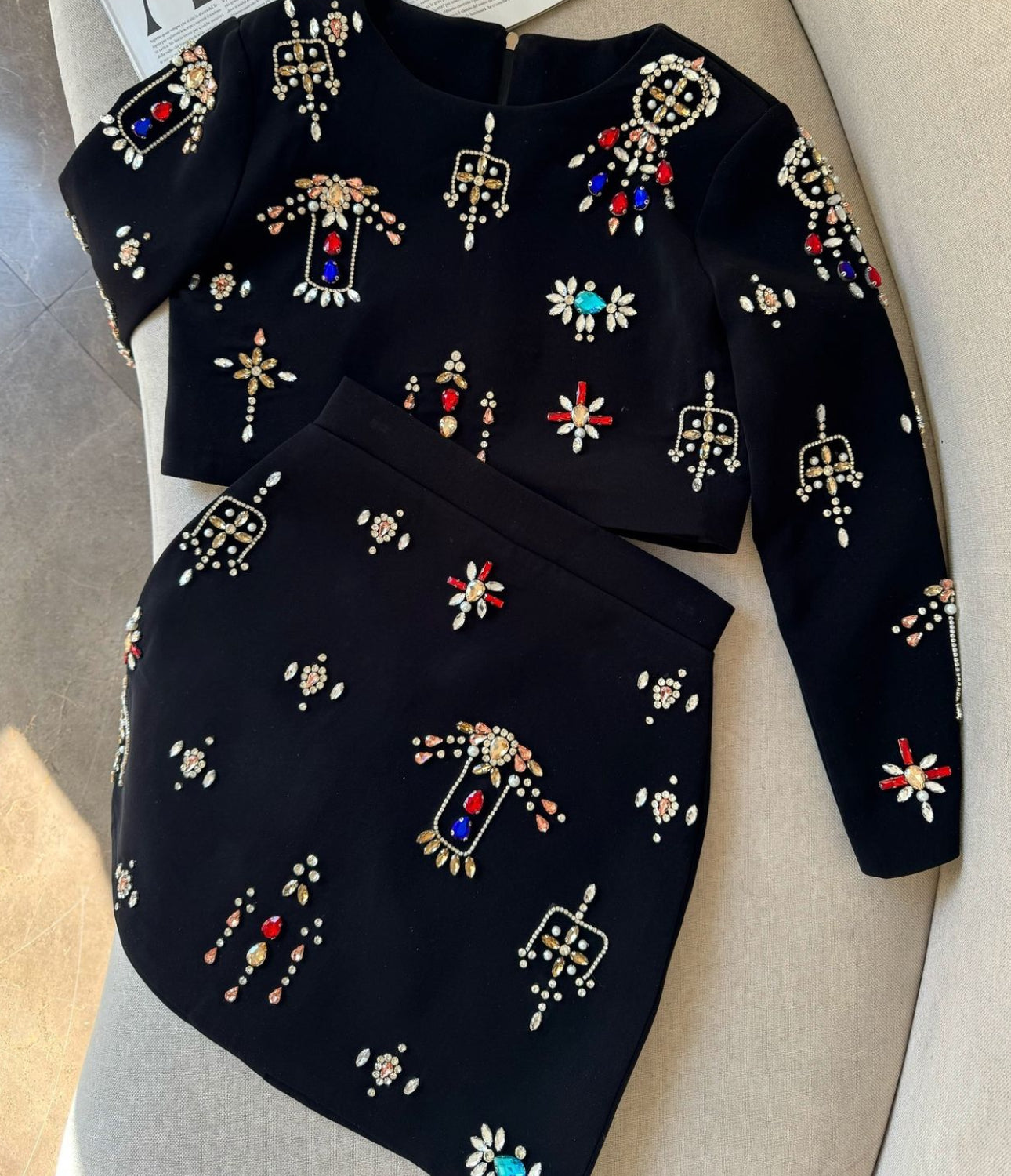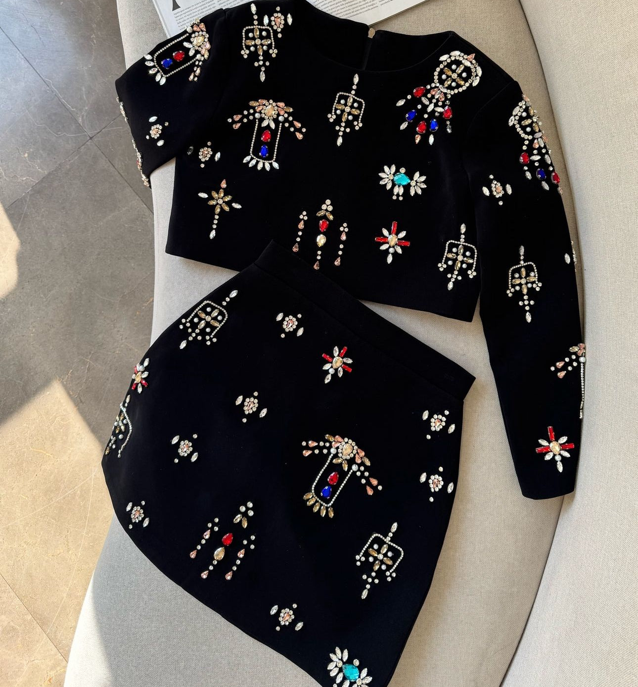 بدلة مكونة من قطعتين مكونة من توب وتنورة مزينة بالكريستالات، مصنوعة من قماش الكريب الأسود 🖤