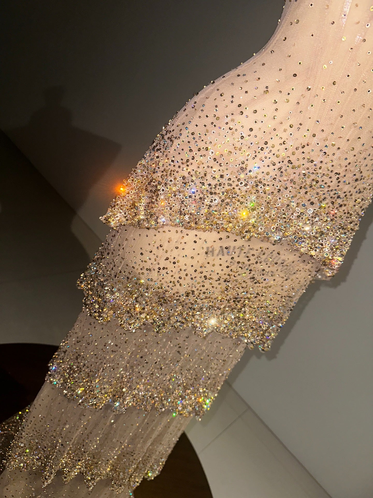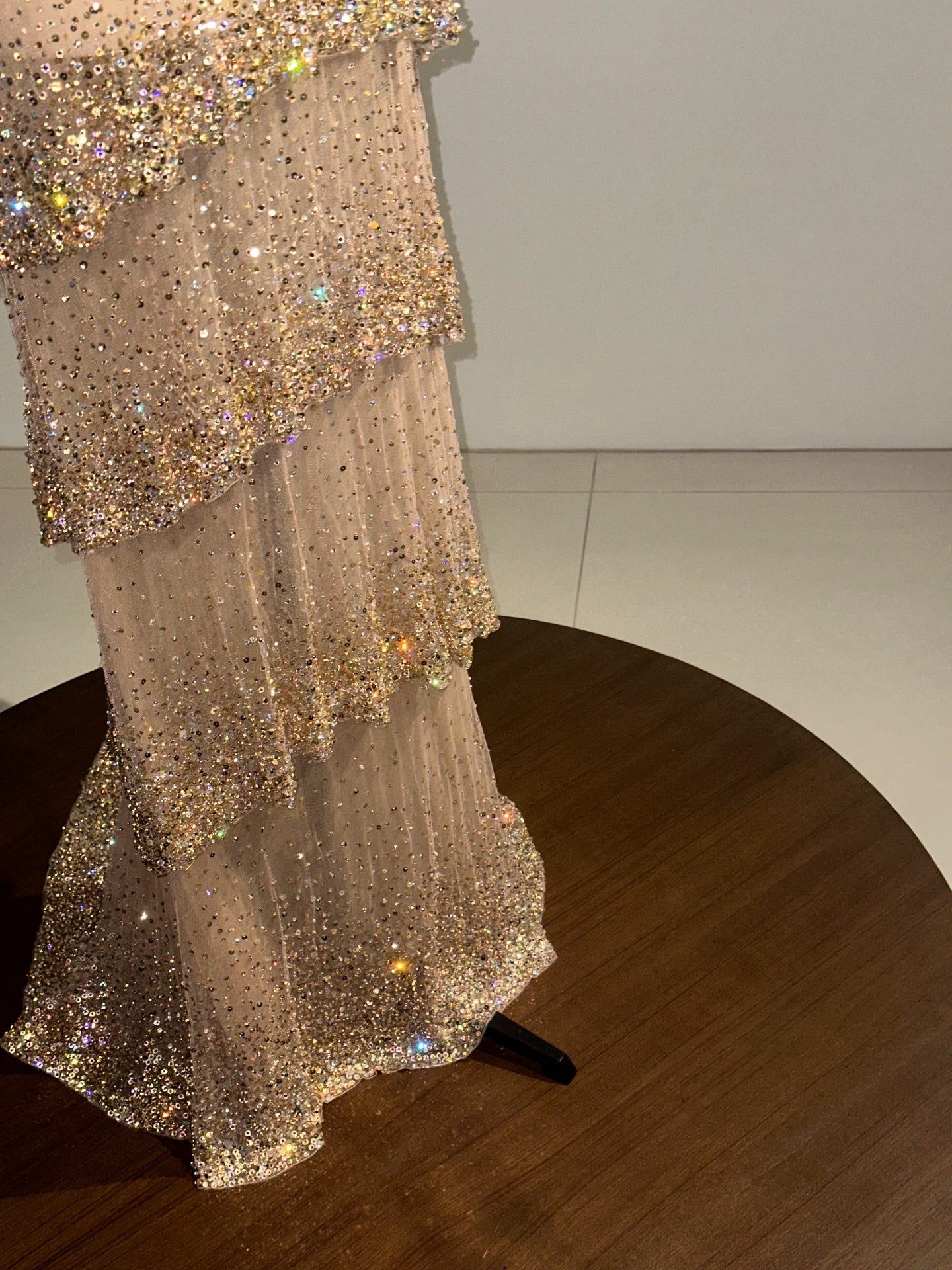 The design flows into soft, embellished layers richly detailed with sparkling beadwork, adding depth, texture, and couture sophistication. Every crystal reflects light effortlessly, showcasing exceptional craftsmanship and artistry.