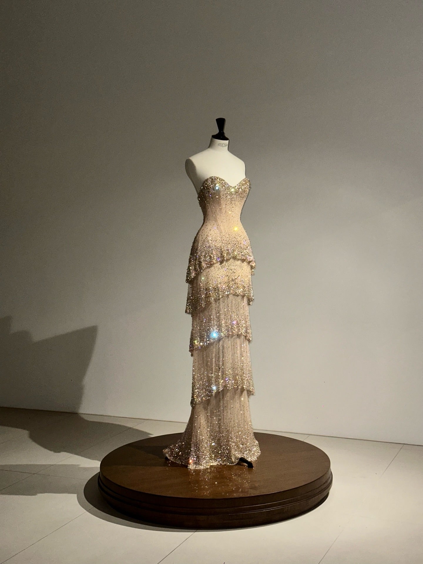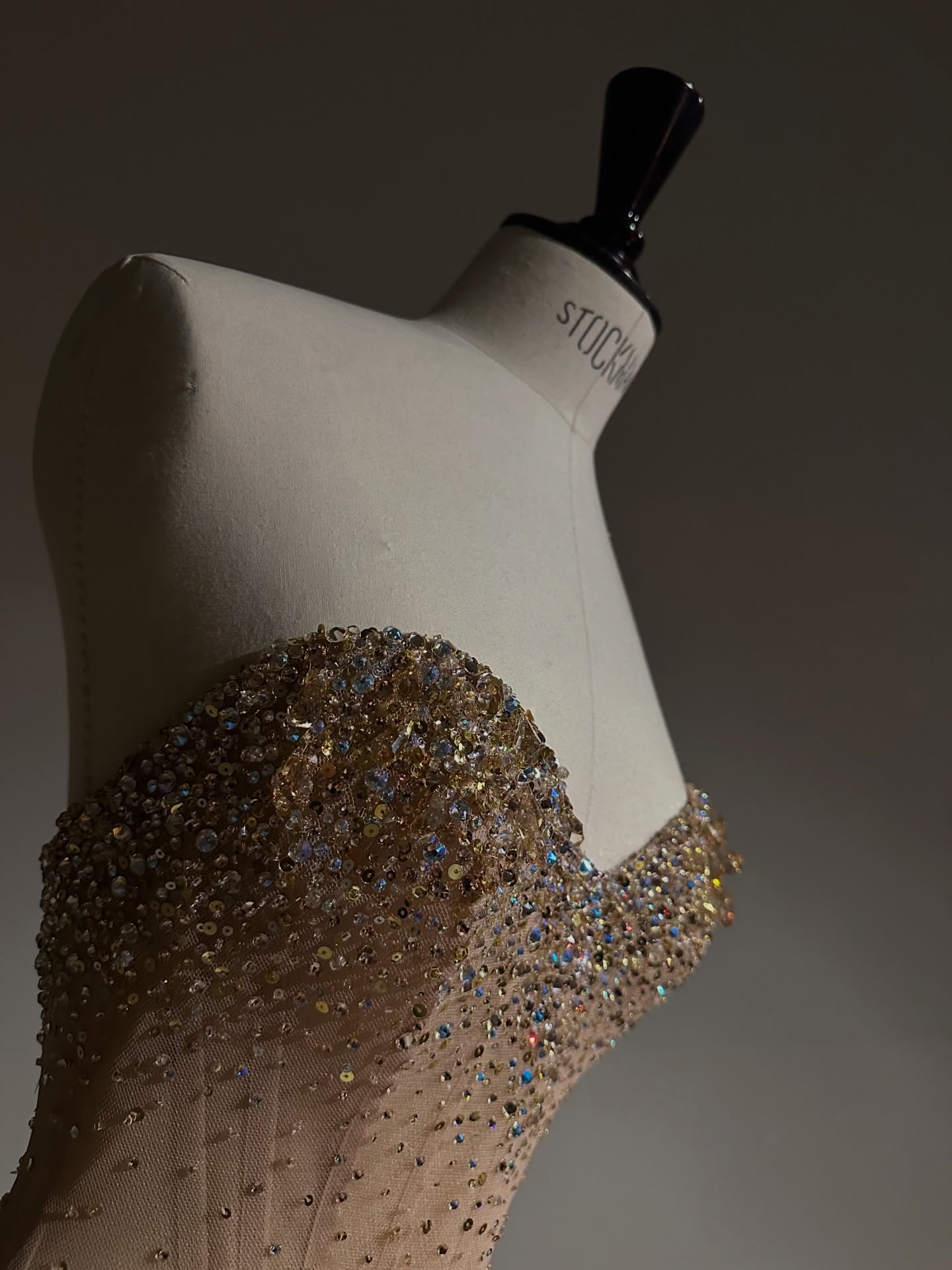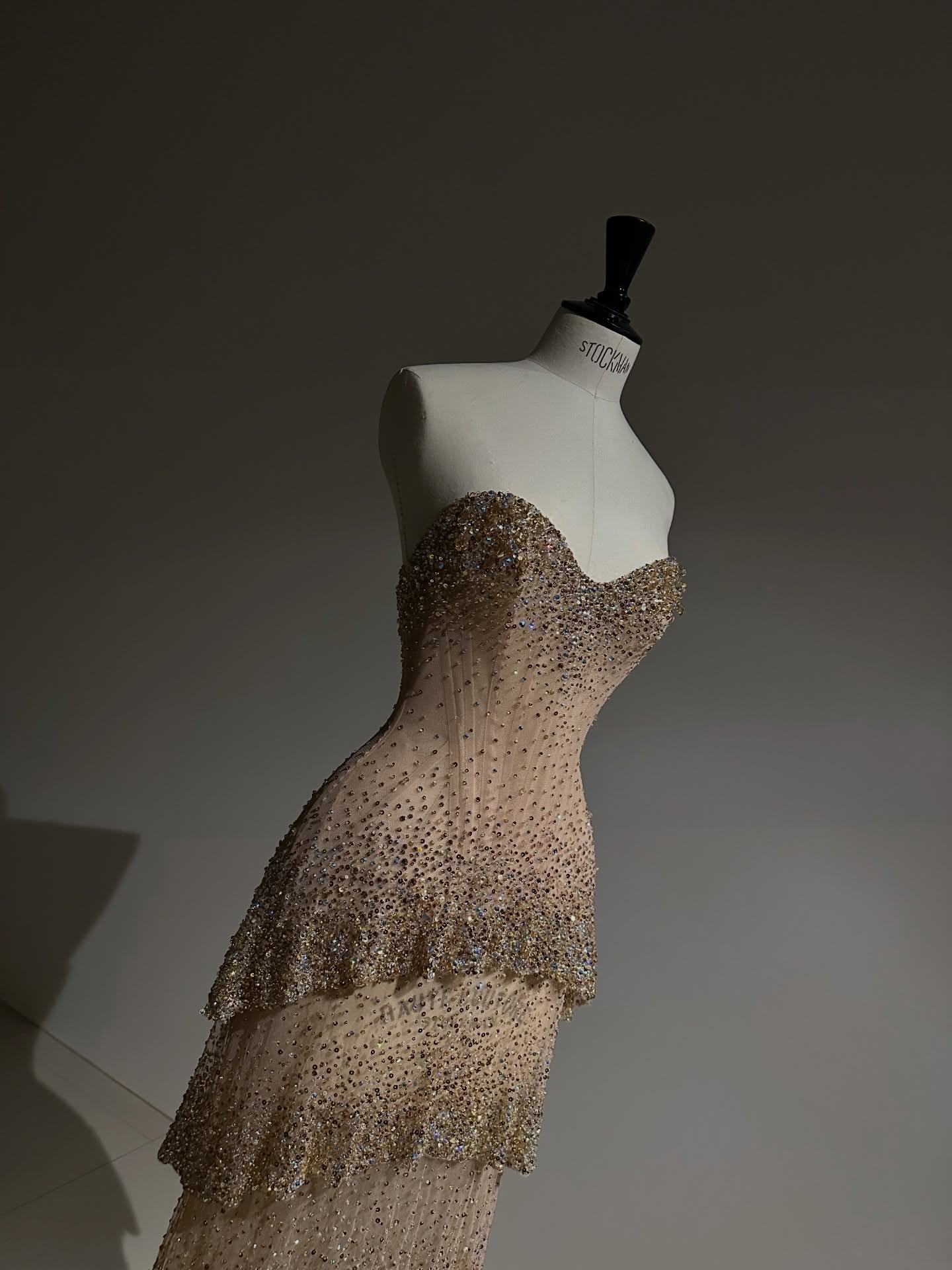 Designed with a sculpted strapless sweetheart corset, it beautifully enhances the silhouette with a flawless, contoured fit. The nude illusion base is delicately adorned with thousands of hand-placed crystals, gradually intensifying from the bodice to the waist to create a captivating shimmer with every movement.