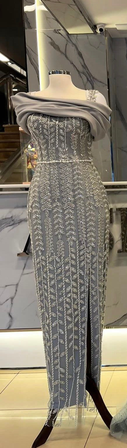 فستان مصمم خصيصًا من التول باللون الرمادي الفضي ومزين بكريستالات سواروفسكي.