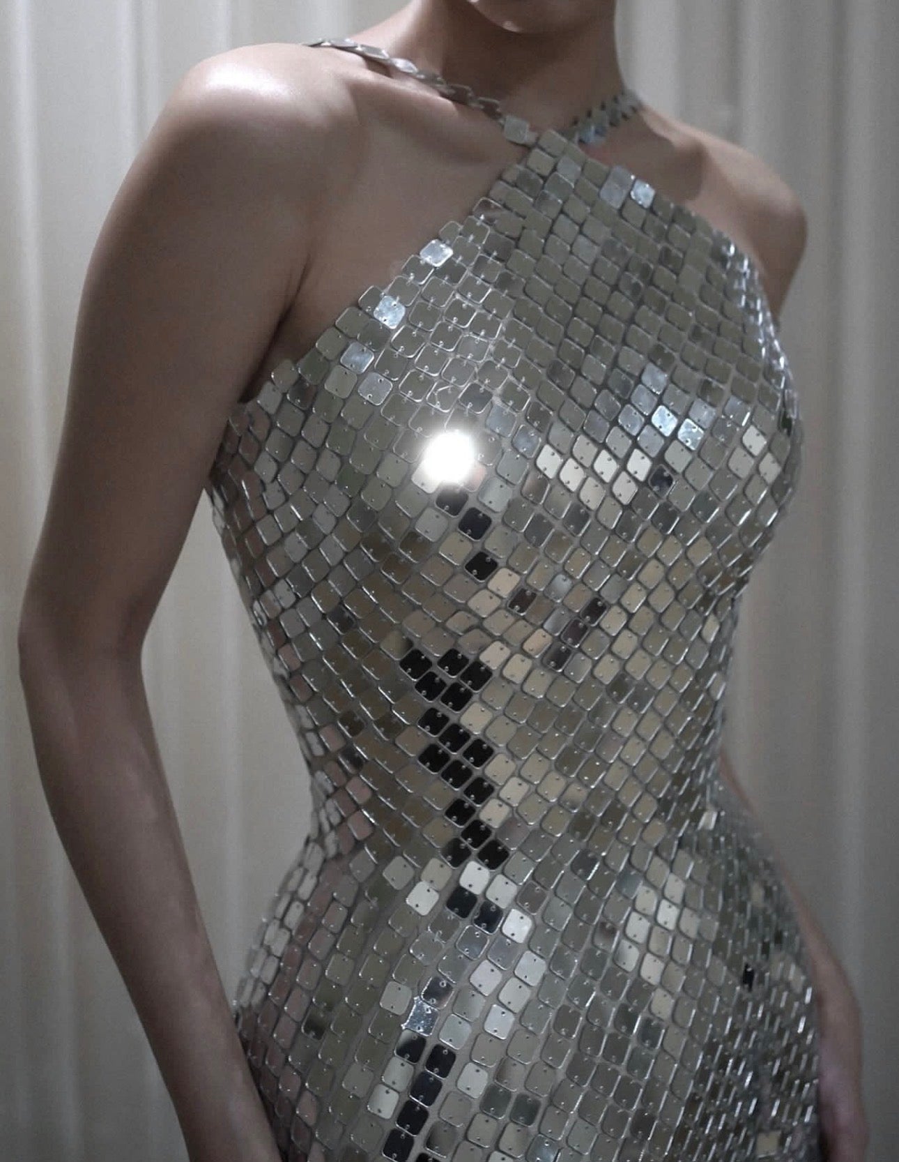 An enchanting dress shimmering with mirror embellishments, crafted in an elegant halter silhouette that catches the light with every movement, giving you a radiant and luxurious presence for any occasion.
