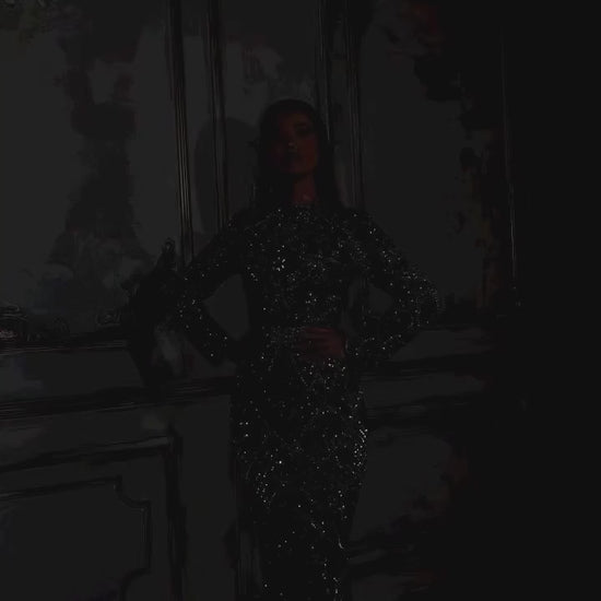 فستان سهرة جاهز للارتداء بأكمام طويلة، مطرز بالكامل بالكريستالات والخرز الفضي اللامع، مصنوع من قماش التول اللامع.