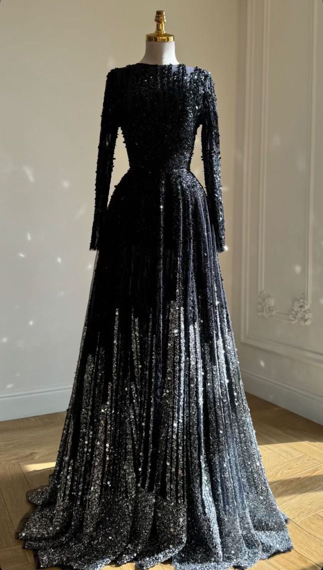 A mesmerizing black gown adorned with intricate black embroidery, creating a mysterious and luxurious allure. Delicate sequins are scattered across the fabric, adding a dazzling sparkle that captivates the eye. The gown features long sleeves and a high neckline, exuding a regal and mythical charm. The flowing skirt is embellished with silver embroidery cascading gracefully, enhancing the gown’s elegance with a touch of radiant brilliance. This masterpiece is the perfect choice for those seeking a breathtaking look that blends sophistication with enchantment.