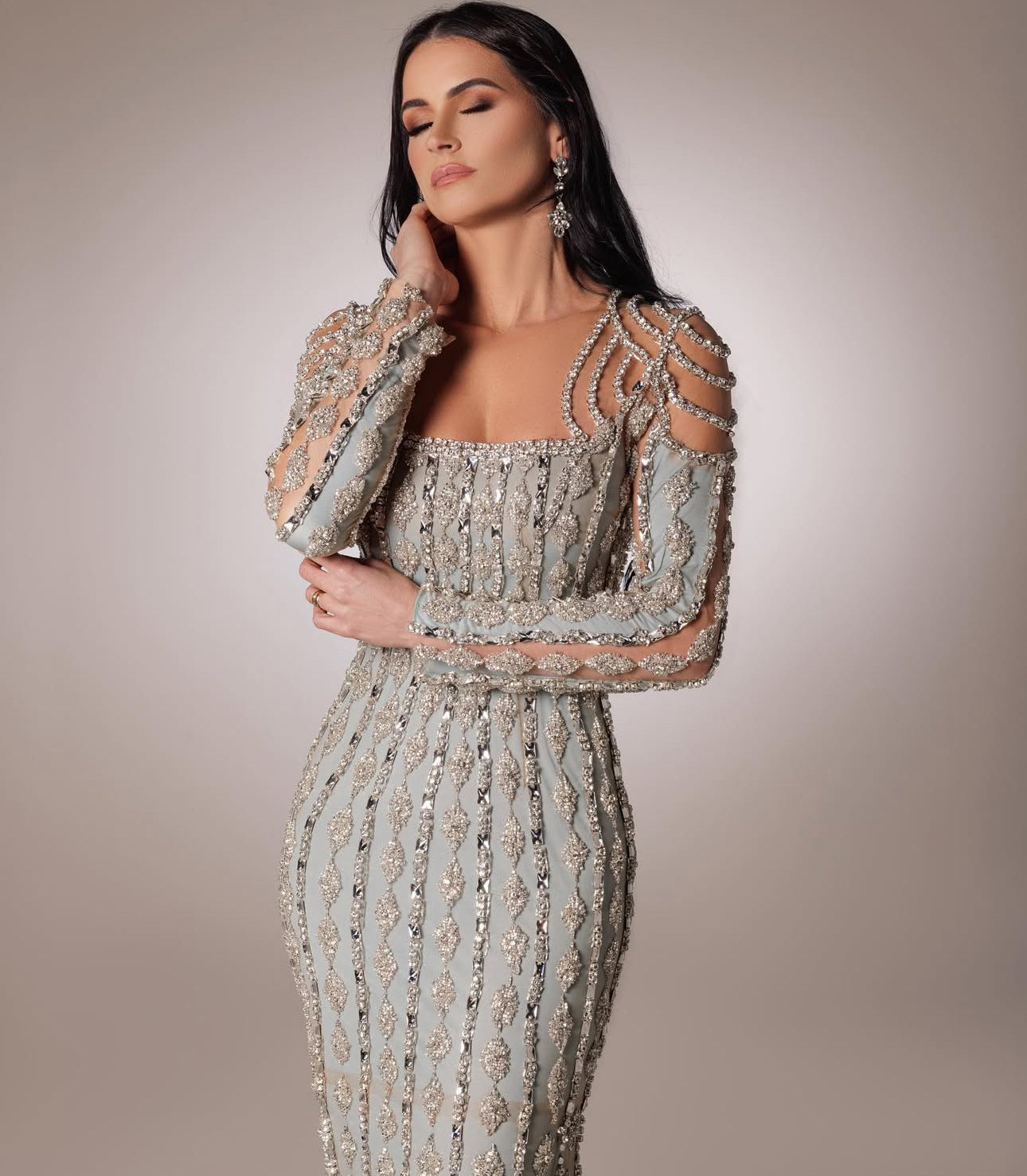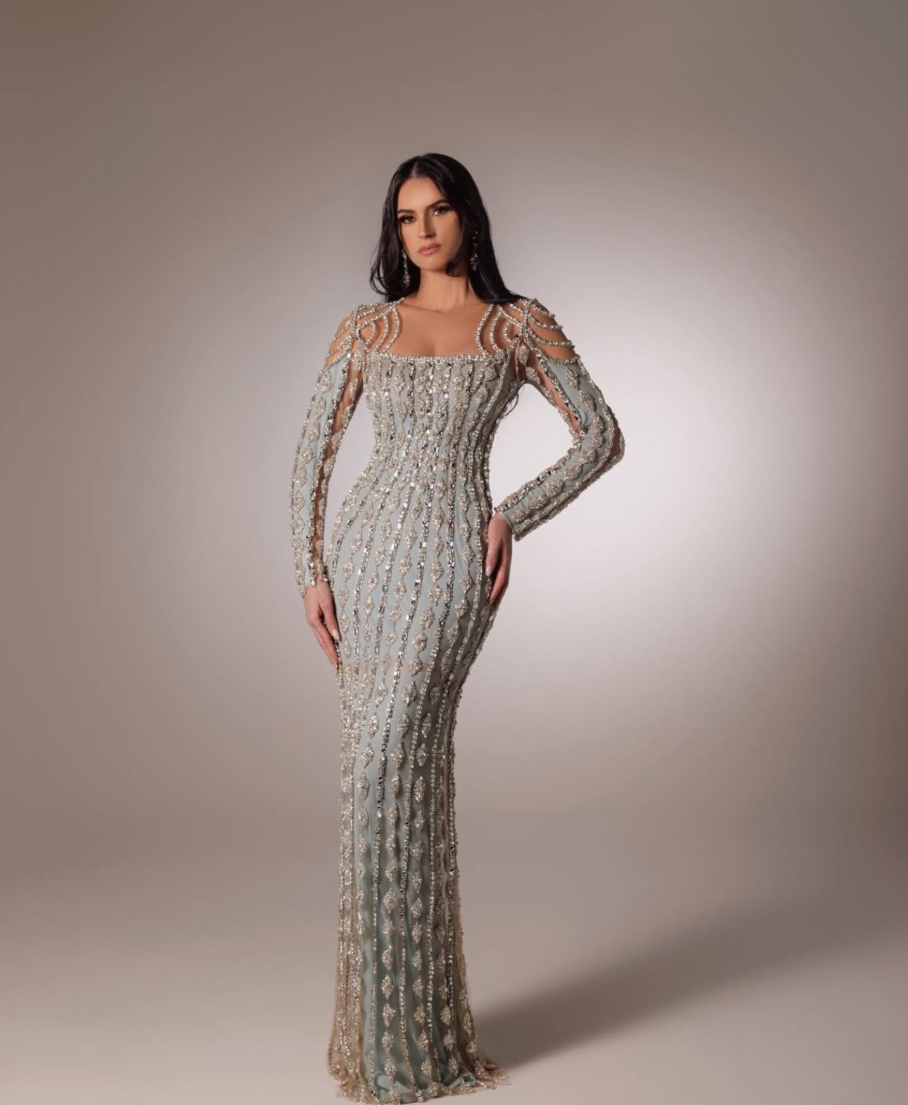 A luxurious gown designed in a form-fitting silhouette that gracefully hugs the body, featuring long sleeves that add a touch of sophistication and modest elegance.