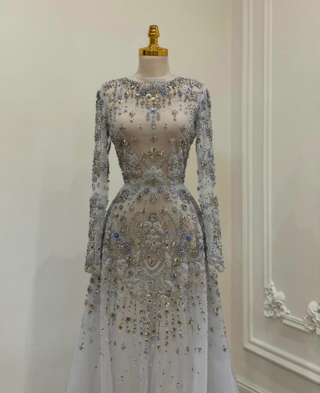 فستان مصمم حسب الطلب من التول الناعم، مطرز يدويًا بالخرز والكريستال