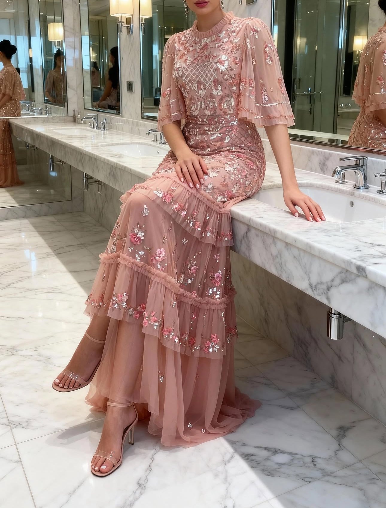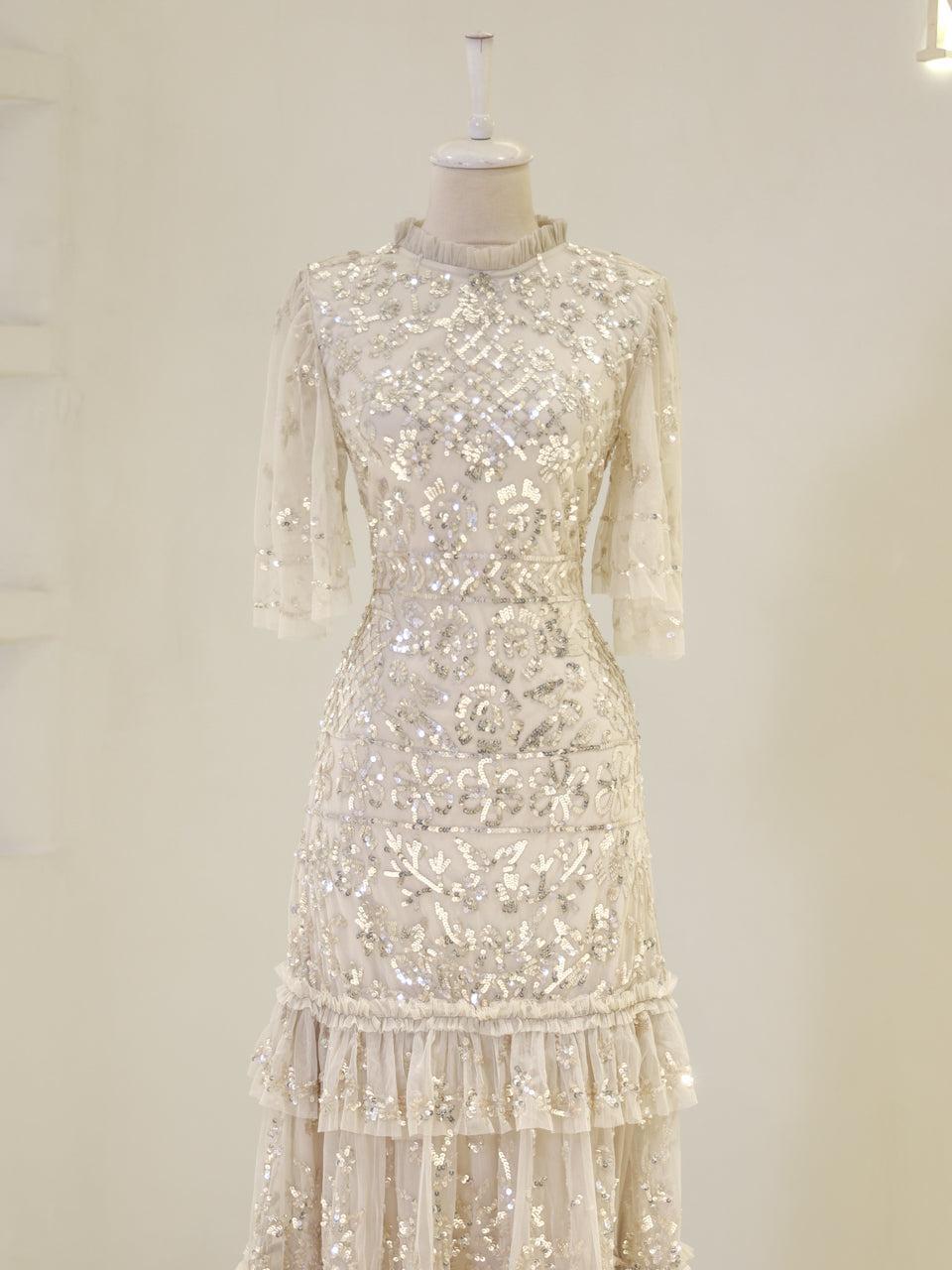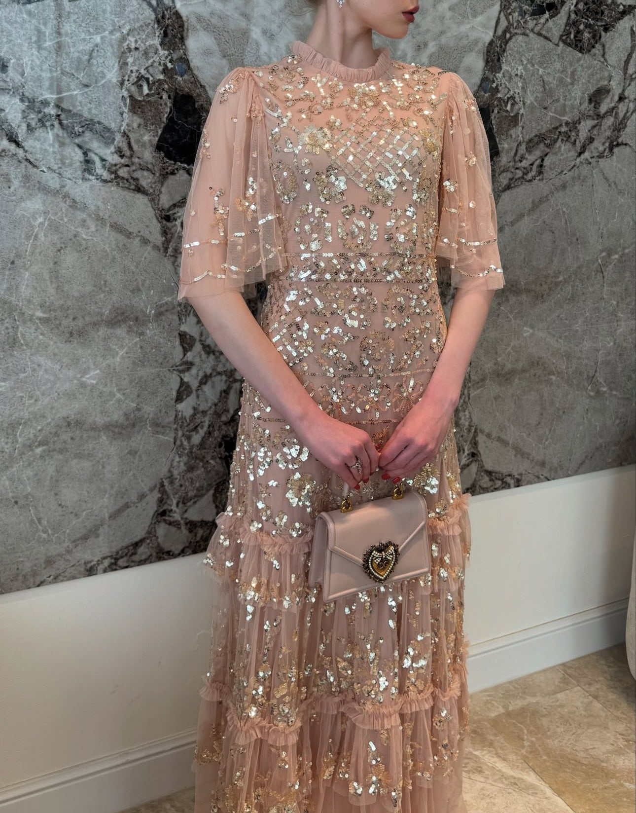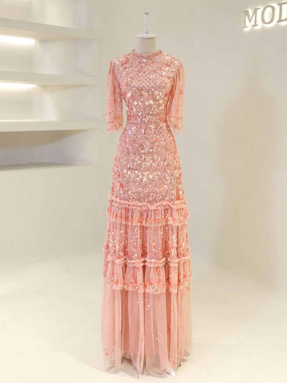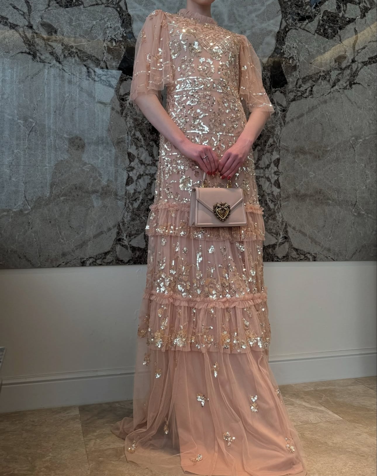 A long, elegant, and modest dress that radiates grace and sophistication. Made from luxurious fabric that drapes beautifully, it’s adorned with delicate embroidery all over, adding a refined touch of sparkle. The sleeves feature a soft, feminine design that complements the dress in perfect harmony, creating a stunning and graceful look for any special occasion.