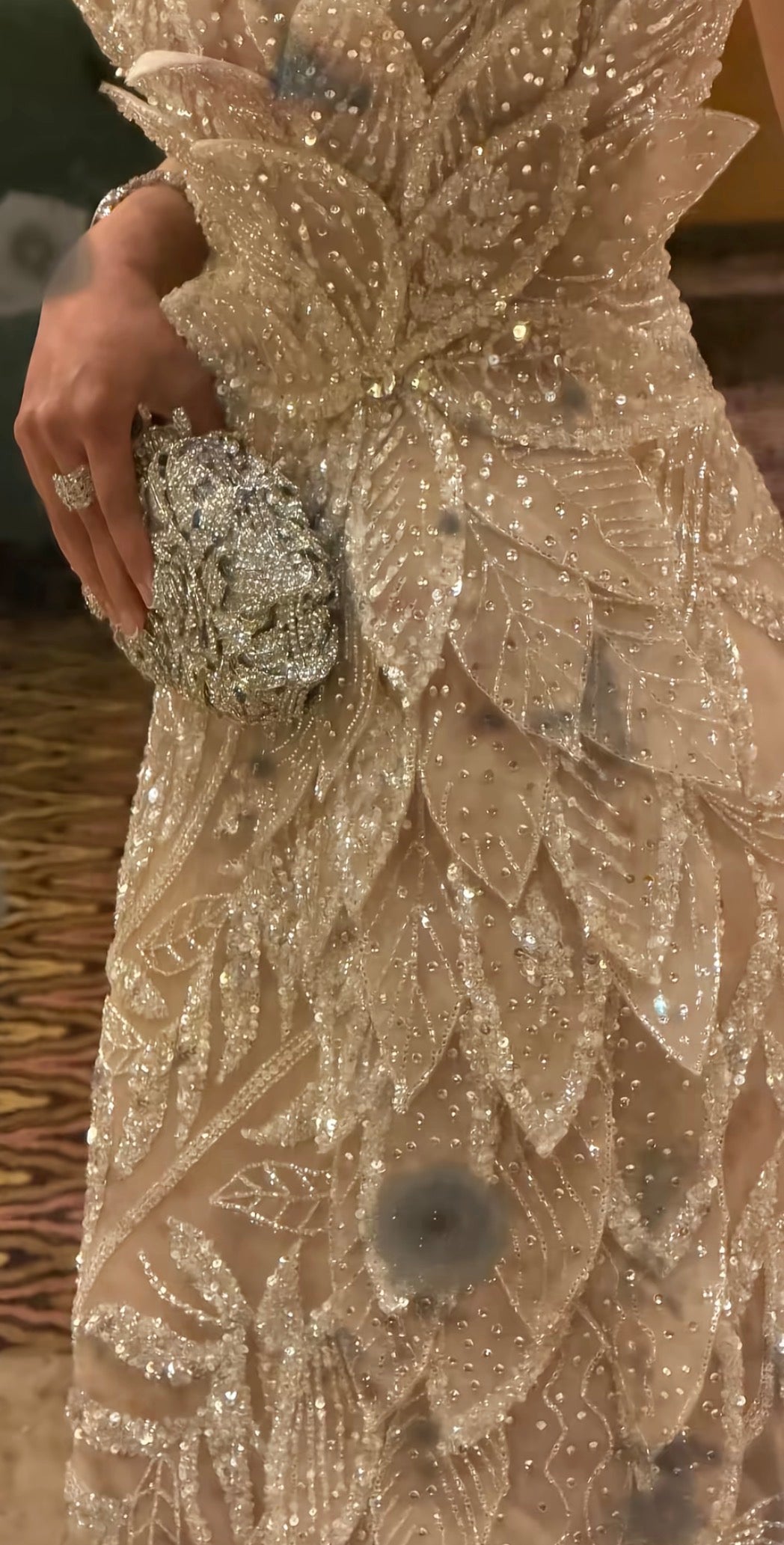A luxurious evening gown with an elegant, feminine design, crafted from sheer nude fabric and fully embellished with intricate beadwork and shimmering sequins. The embroidery is inspired by overlapping leaf motifs that flow harmoniously along the length of the dress.