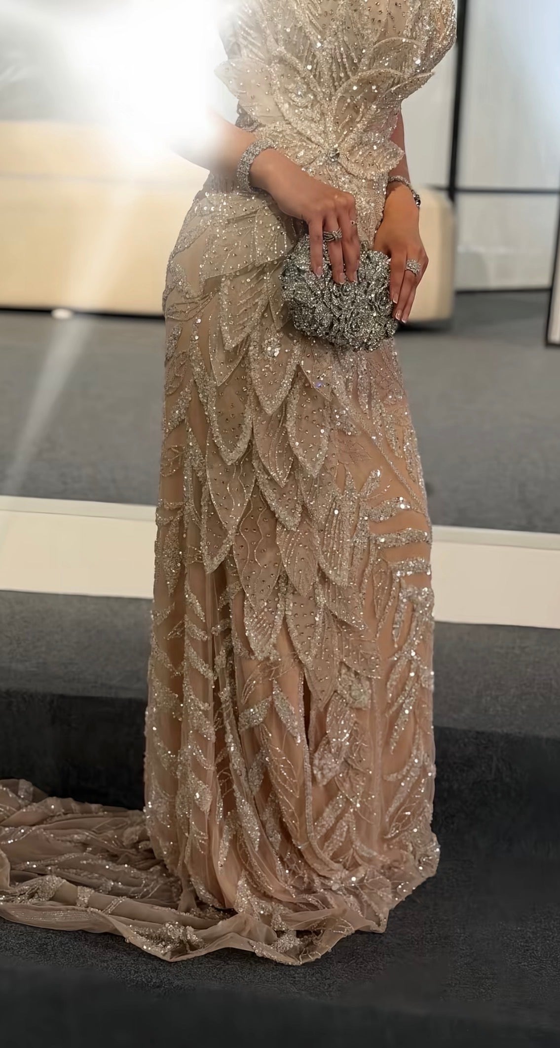 فستان سهرة فاخر بتصميم أنثوي راقٍ، مصنوع من قماش التول بلون النيود ومطرّز بالكامل بتطريزات دقيقة من الخرز والكريستال اللامع، مستوحاة من أشكال أوراق متداخلة تنساب بانسجام على طول الفستان.