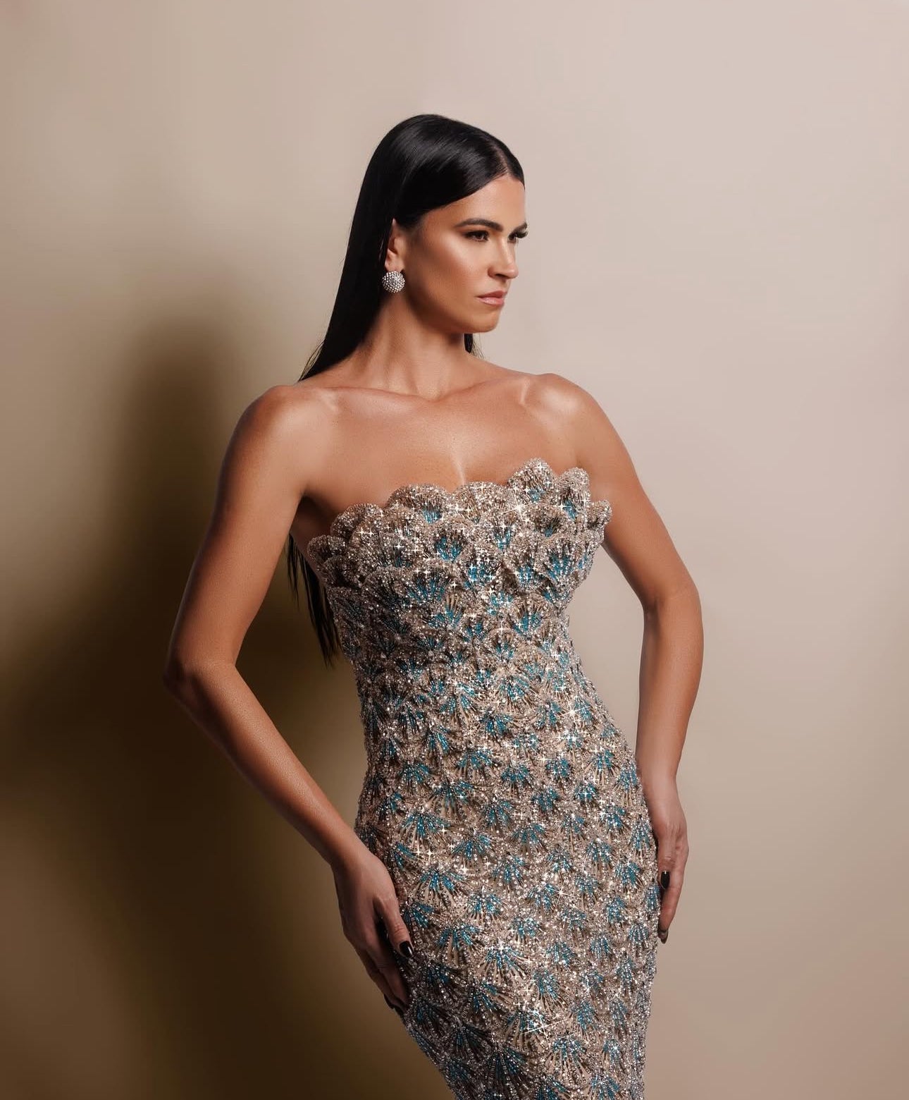 The figure-hugging silhouette enhances the natural curves with refined elegance, while the blue embellishments add a dramatic, enchanting touch, twinkling under the lights like scattered stars.