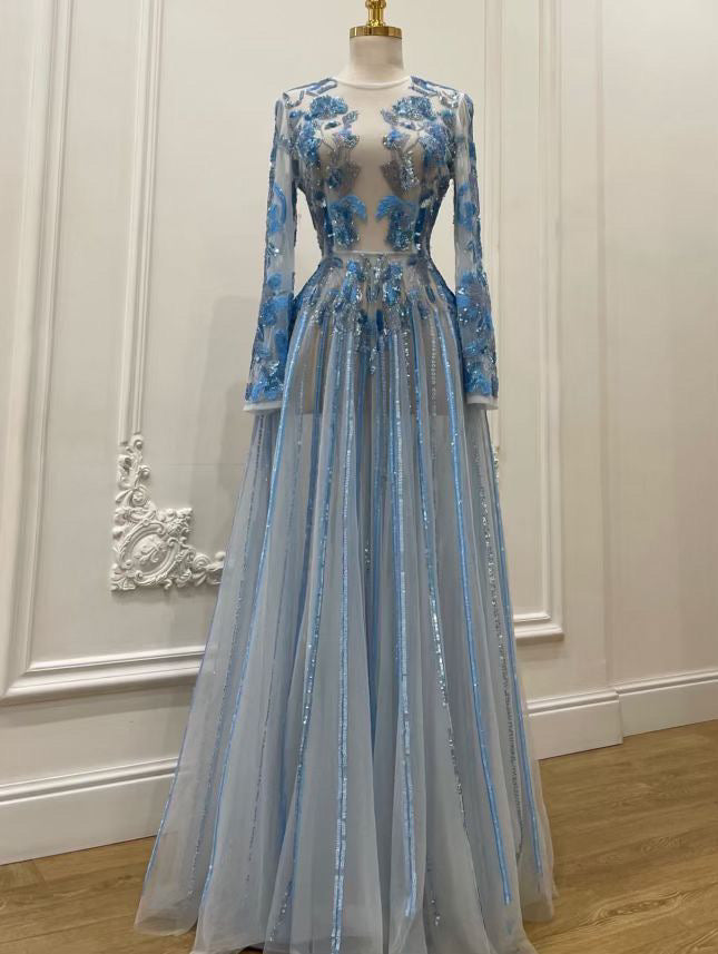 “A celestial baby blue dress, crafted with luxurious fabrics and intricate detailing, radiates a soft, ethereal glow. The heavy construction adds a sense of grandeur, while the delicate blue hue evokes the serene beauty of the heavens. Perfect for those seeking an elegant and majestic presence, this dress combines timeless sophistication with a touch of cosmic allure.”