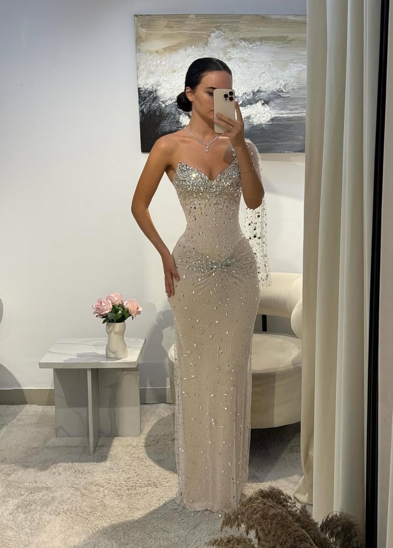 A mesmerizing masterpiece that blends elegance and radiance. The Celestial Grace gown is meticulously hand-embellished with thousands of sparkling crystals that shimmer like stars in the night sky. Its graceful silhouette flows effortlessly, hugging the body with refined charm. Crafted for a true queen, this gown promises a breathtakingly luxurious look