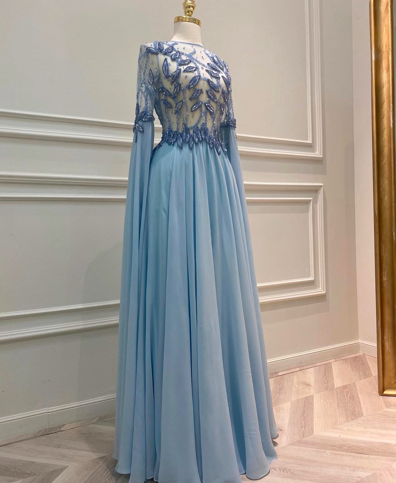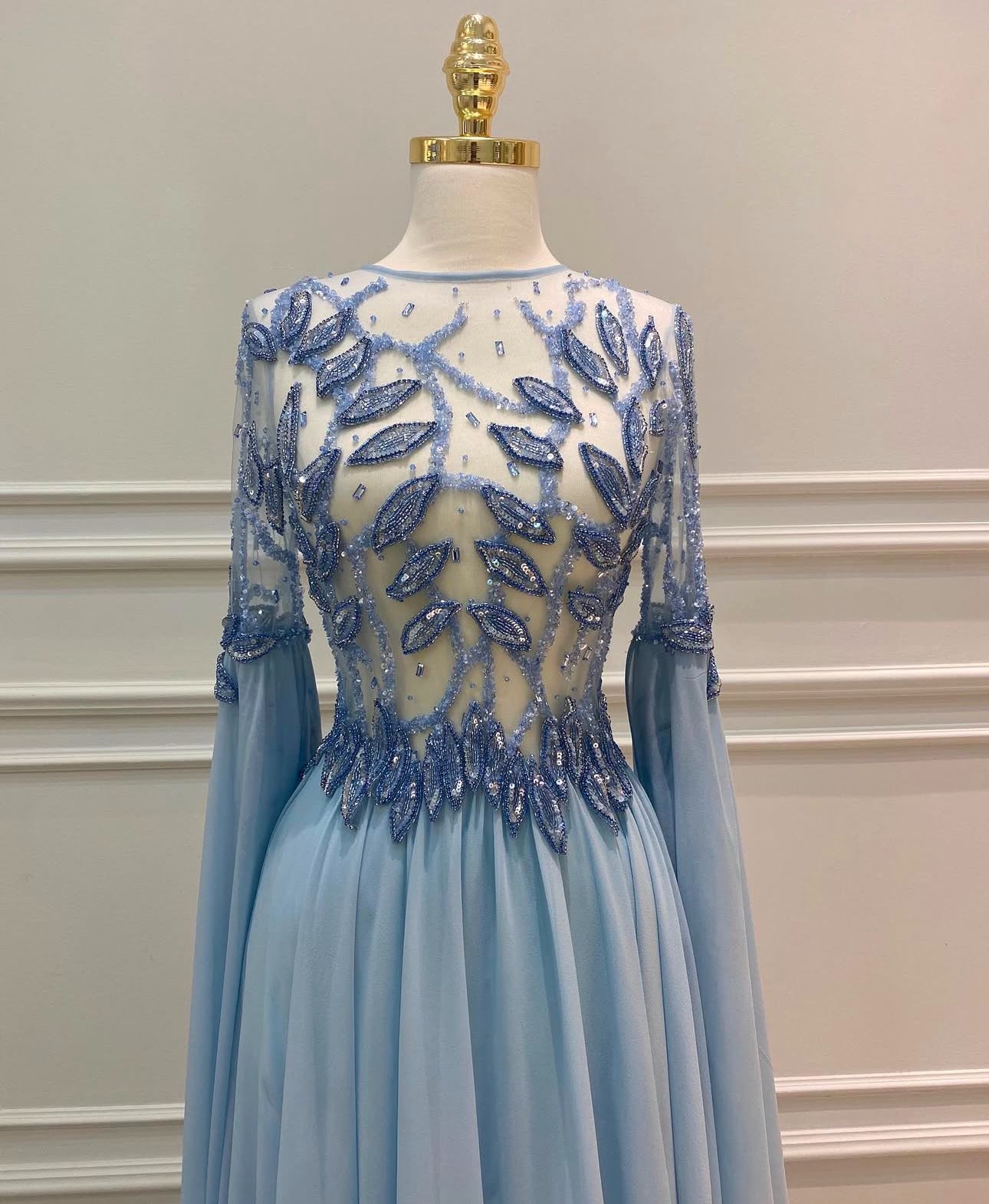 A custom-made double flared chiffon dress with embroidery on top made of tulle, and the type of embroidery includes beads and crystal stones.