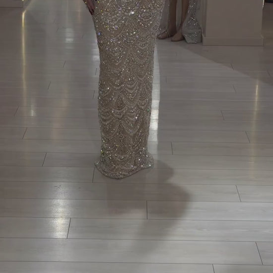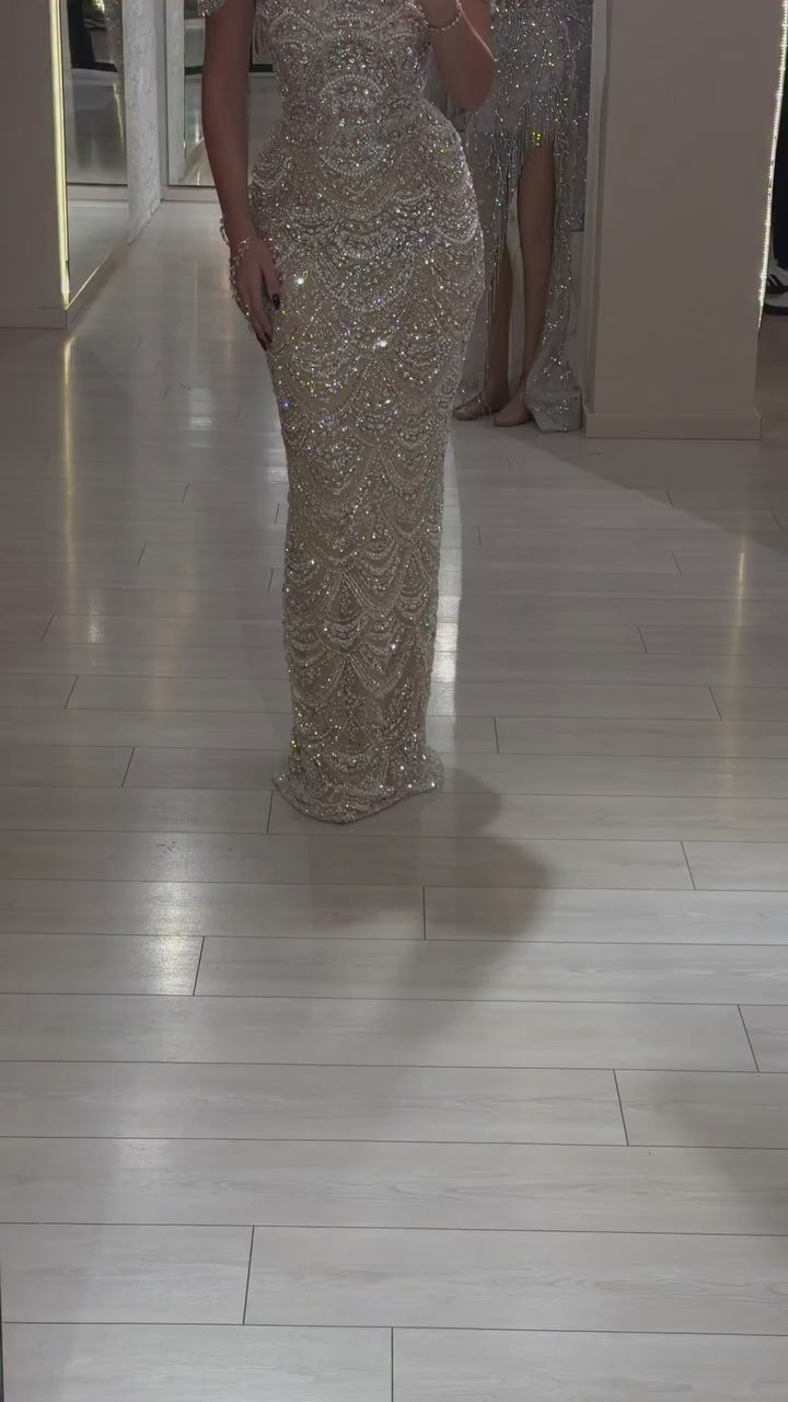 A stunning custom-made dress, meticulously hand-embroidered with sparkling crystals and lustrous pearls, designed to create an elegant and luxurious look. Perfect for special occasions, it combines craftsmanship with timeless beauty.