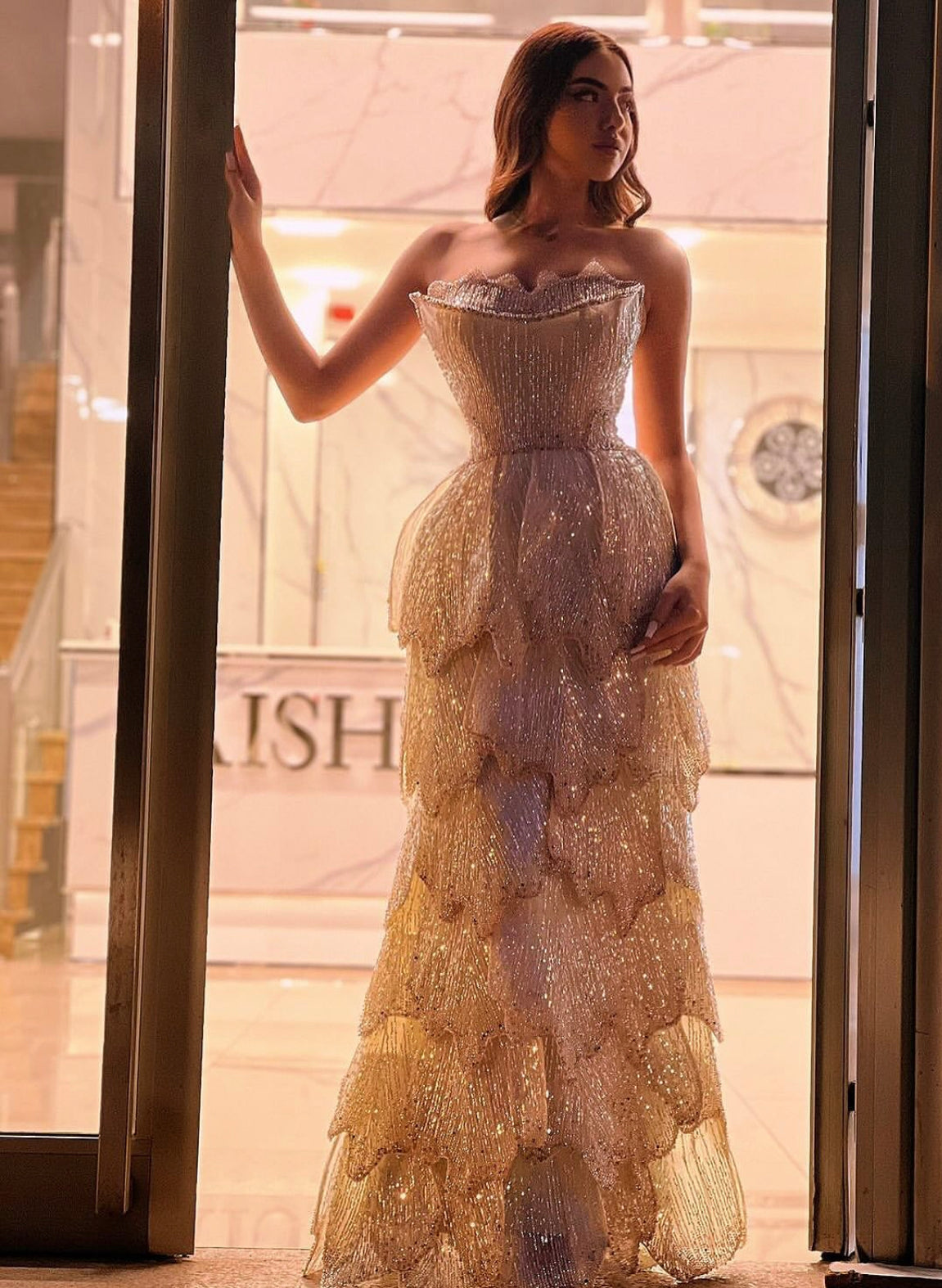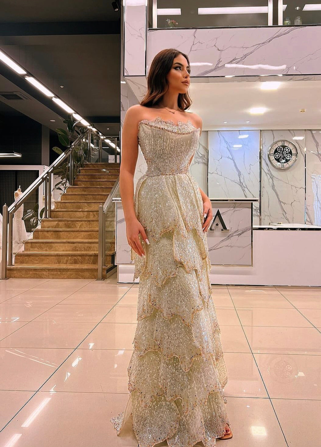 A custom-made dress with layers and full embroidery featuring gold and silver gradient beading
