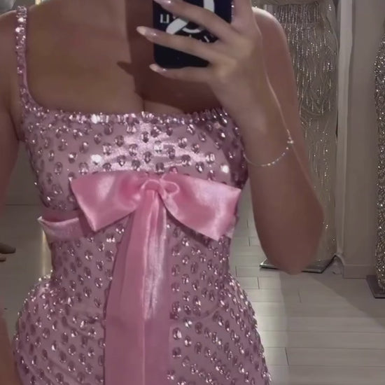 A beautiful pink dress adorned with sparkling crystals, featuring a delicate pink bow for an extra touch of charm and elegance. Perfect for special occasions, it combines glamour with a feminine, playful style.