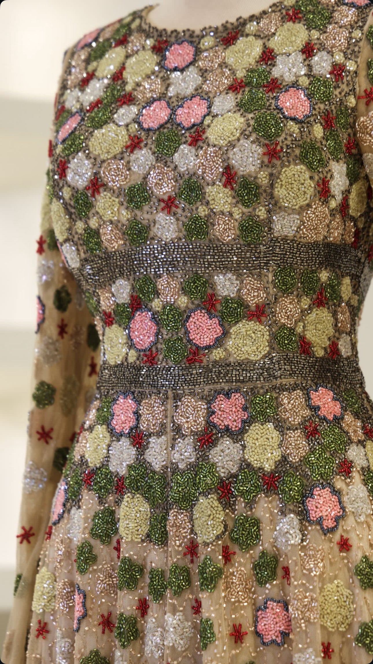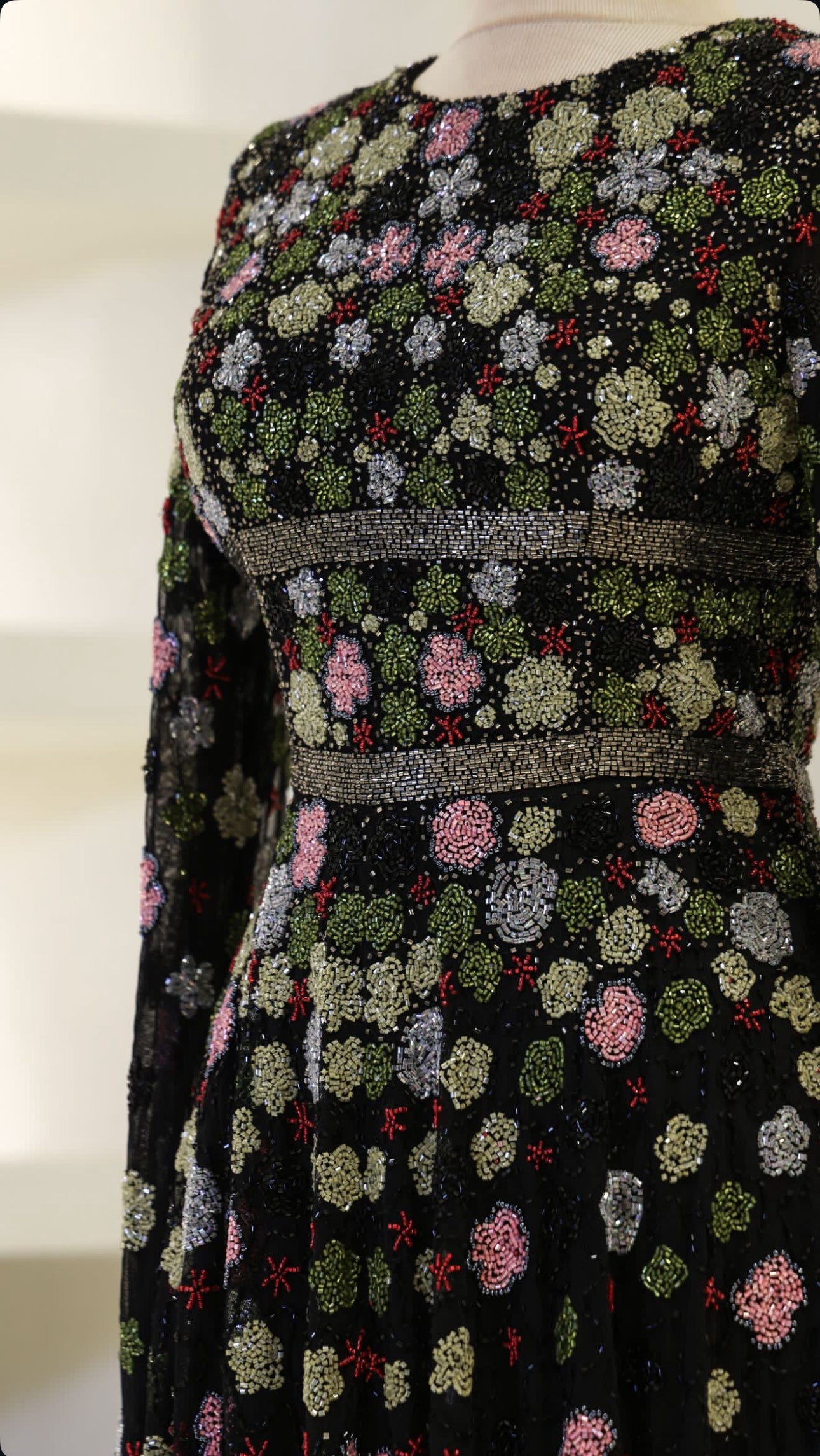 A stunning embroidered gown adorned with intricate floral patterns crafted from beads in black, green, and beige tones. The delicate beadwork forms elegant roses across the fabric, giving the dress a luxurious and sophisticated texture. Perfect for evening events or special occasions, this gown combines classic elegance with a modern, artistic touch.