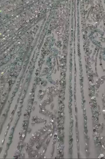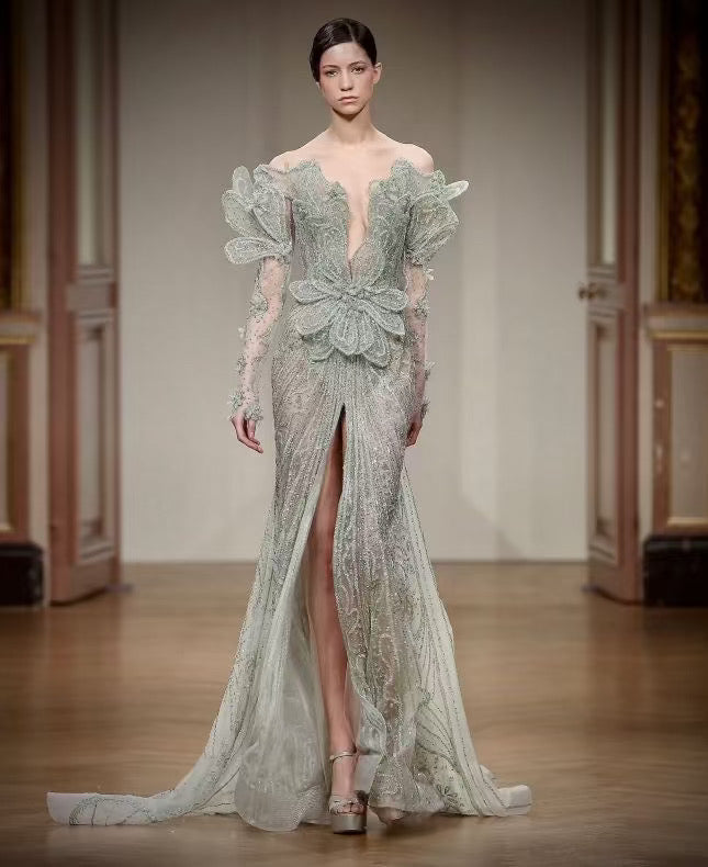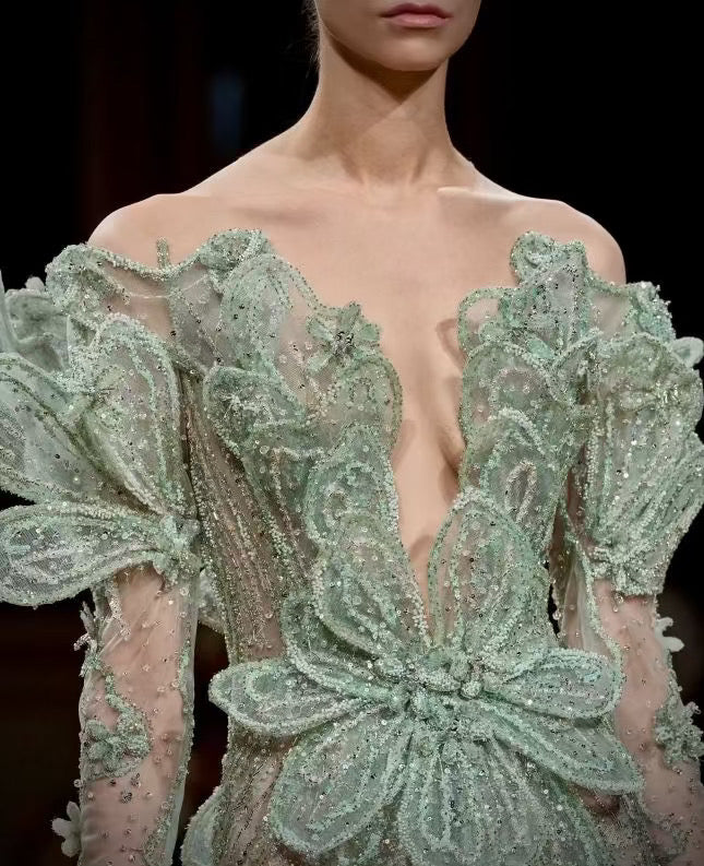 A light green embroidered dress flows gracefully like spring waves over the body, made of sheer, delicate fabric that glows with every movement. At its center lies a stunning design: shimmering flowers carefully arranged along the middle of the dress, as if pulsing with life, stitched with luminous threads and tiny gemstones that reflect light like dewdrops on petals.