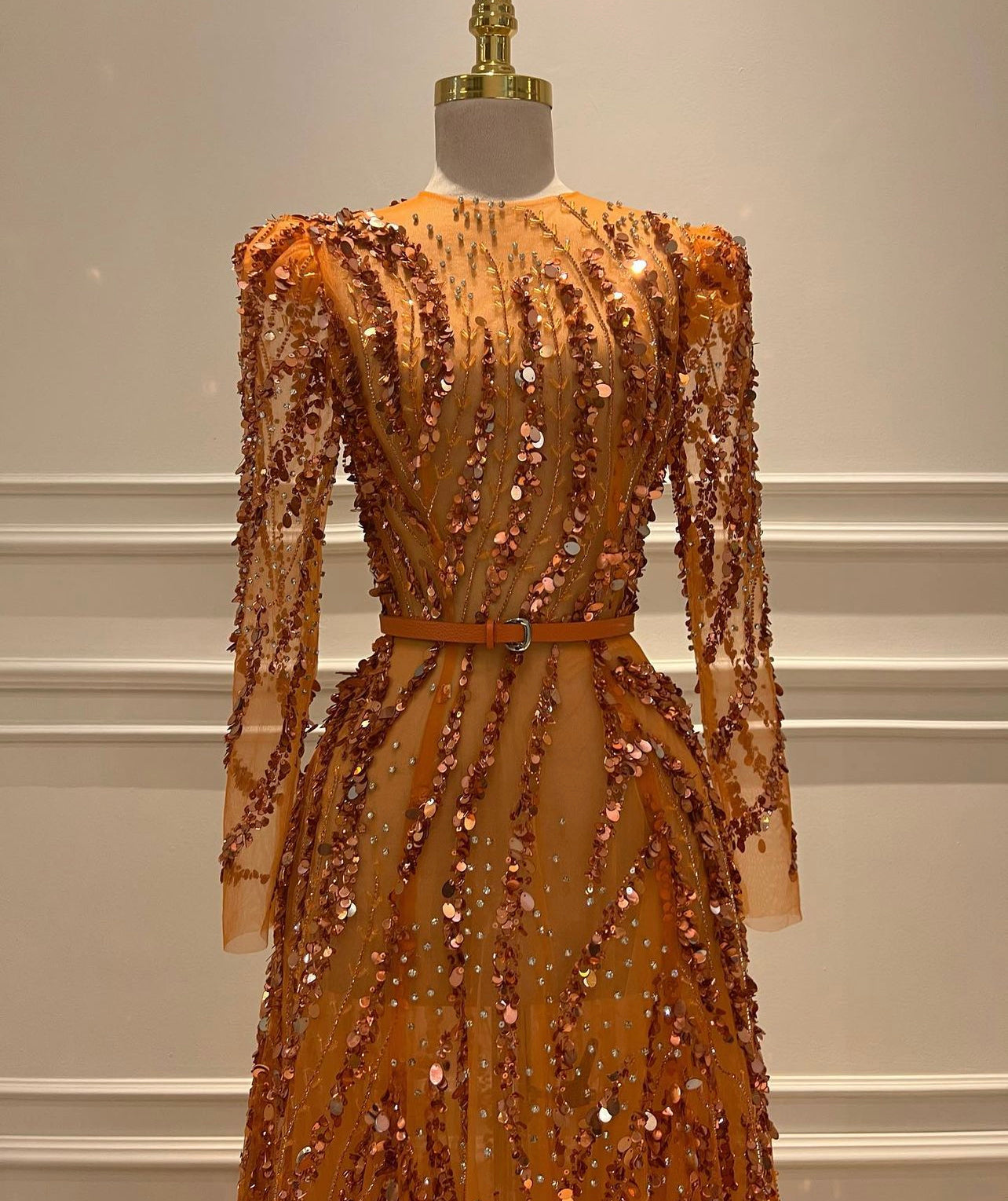 A custom-made dress in fiery orange, crafted from tulle fabric embroidered with crystals, beads, and large sequins