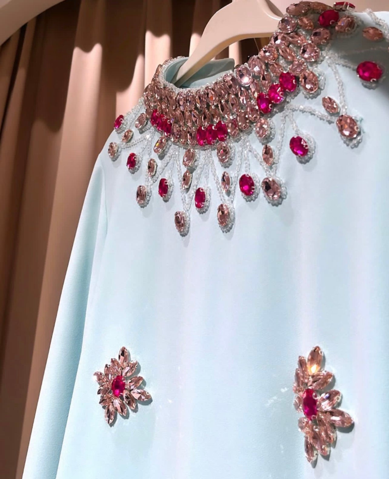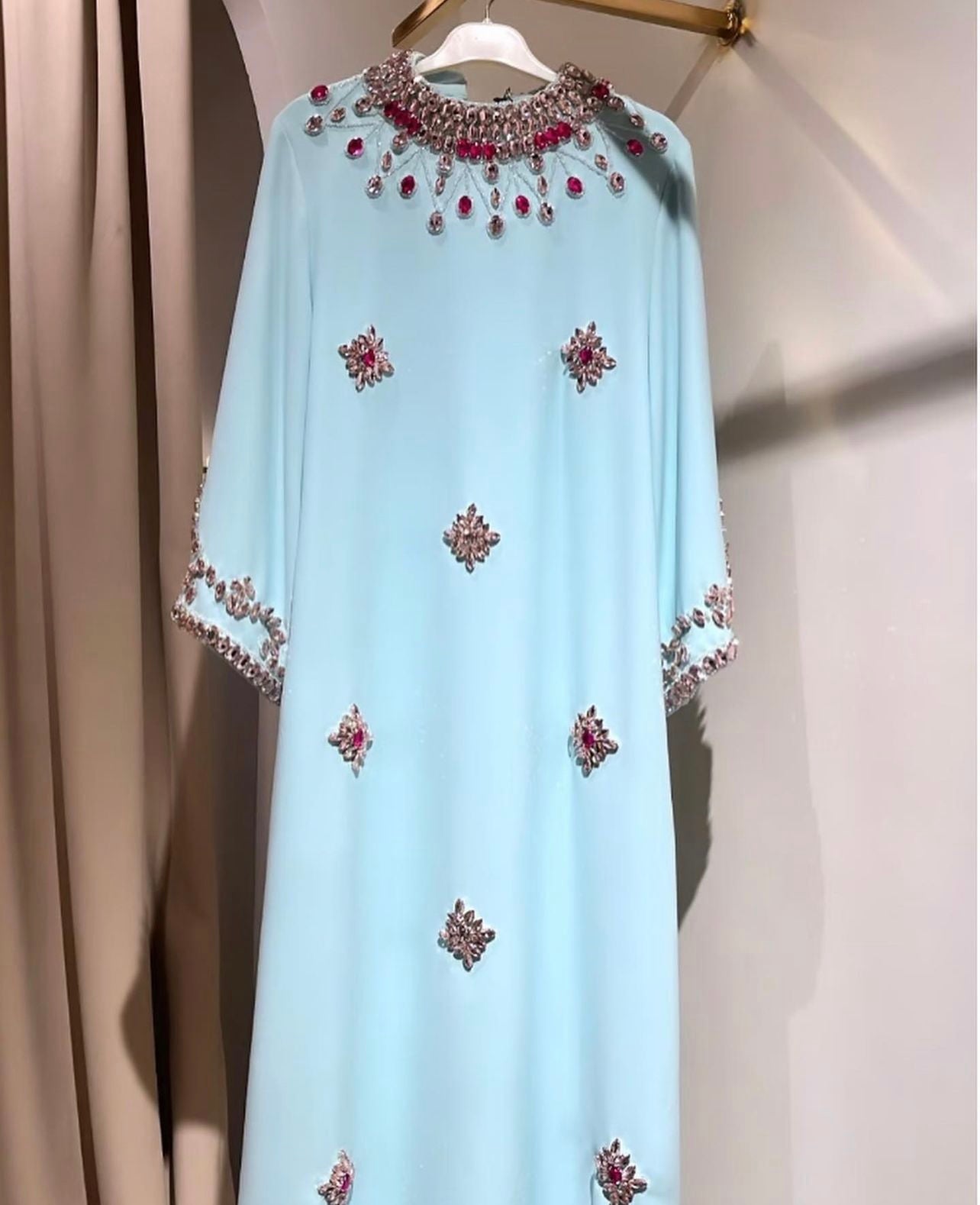 A custom-made dress in an Arabic style, crafted from crepe fabric, heavily and prominently embroidered with crystals.