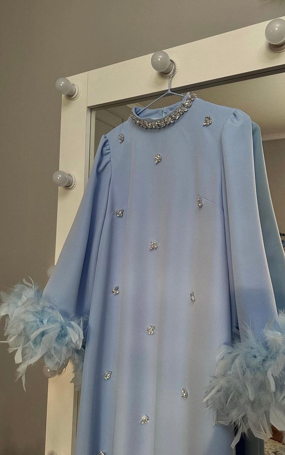 A custom-made dress crafted from luxurious crepe fabric, hand-embellished with sparkling crystals and featuring soft feathers on the sleeves