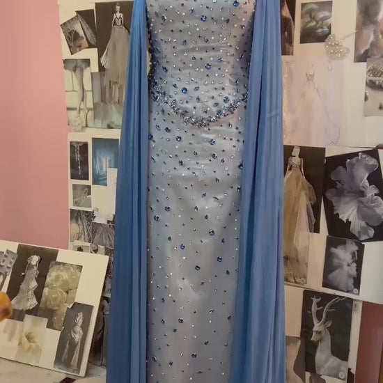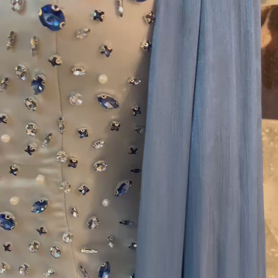 An elegant ice-blue gown crafted with a sleek, body-skimming silhouette, adorned with meticulously hand-placed crystals that shimmer beautifully with every movement. The design is enhanced by soft, flowing sheer side panels, adding depth and luxury to the look. A refined and modern statement piece that radiates confidence, sophistication, and effortless glamour.