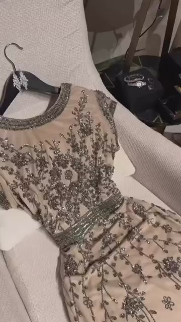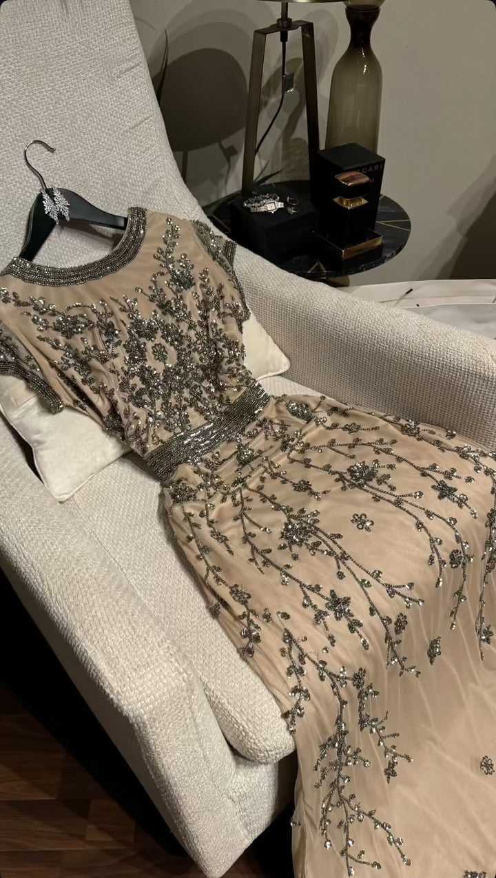 A stunning beige gown adorned with silver-gray embroidery that beautifully enhances the warmth of the beige tone. The delicate yet detailed embellishments catch the light with every movement, adding a subtle shimmer that elevates the gown’s elegance. The contrast between the soft beige fabric and the cool silver-gray embroidery creates a refined harmony, making the dress both graceful and captivating — perfect for a sophisticated and timeless look.