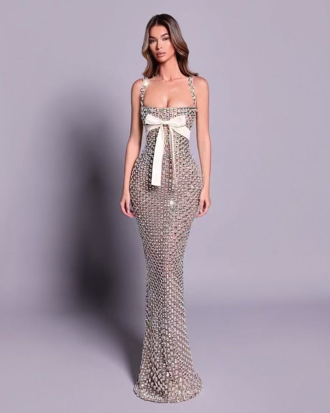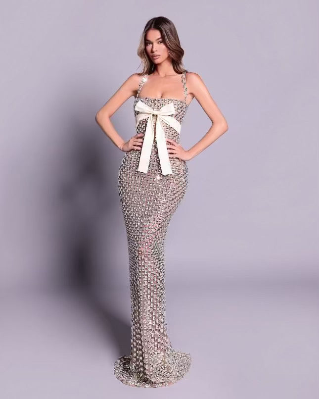 An elegant dress embellished with sparkling rhinestones, featuring luxurious details that add a touch of glamour and sophistication — perfect for special occasions and evening events.