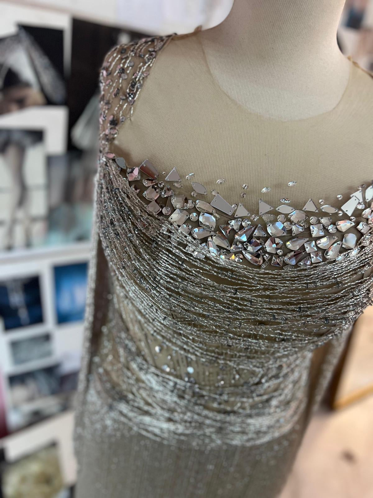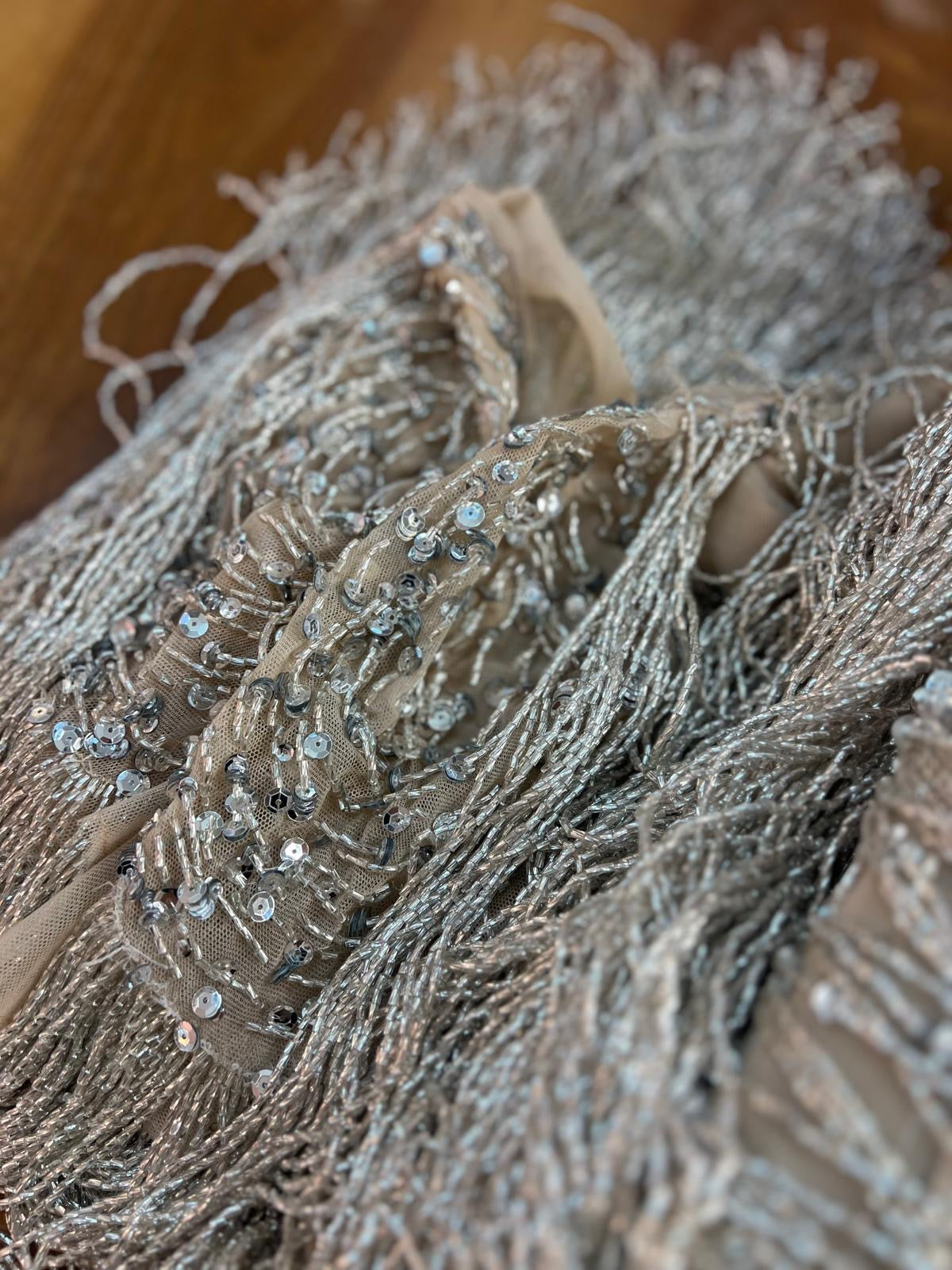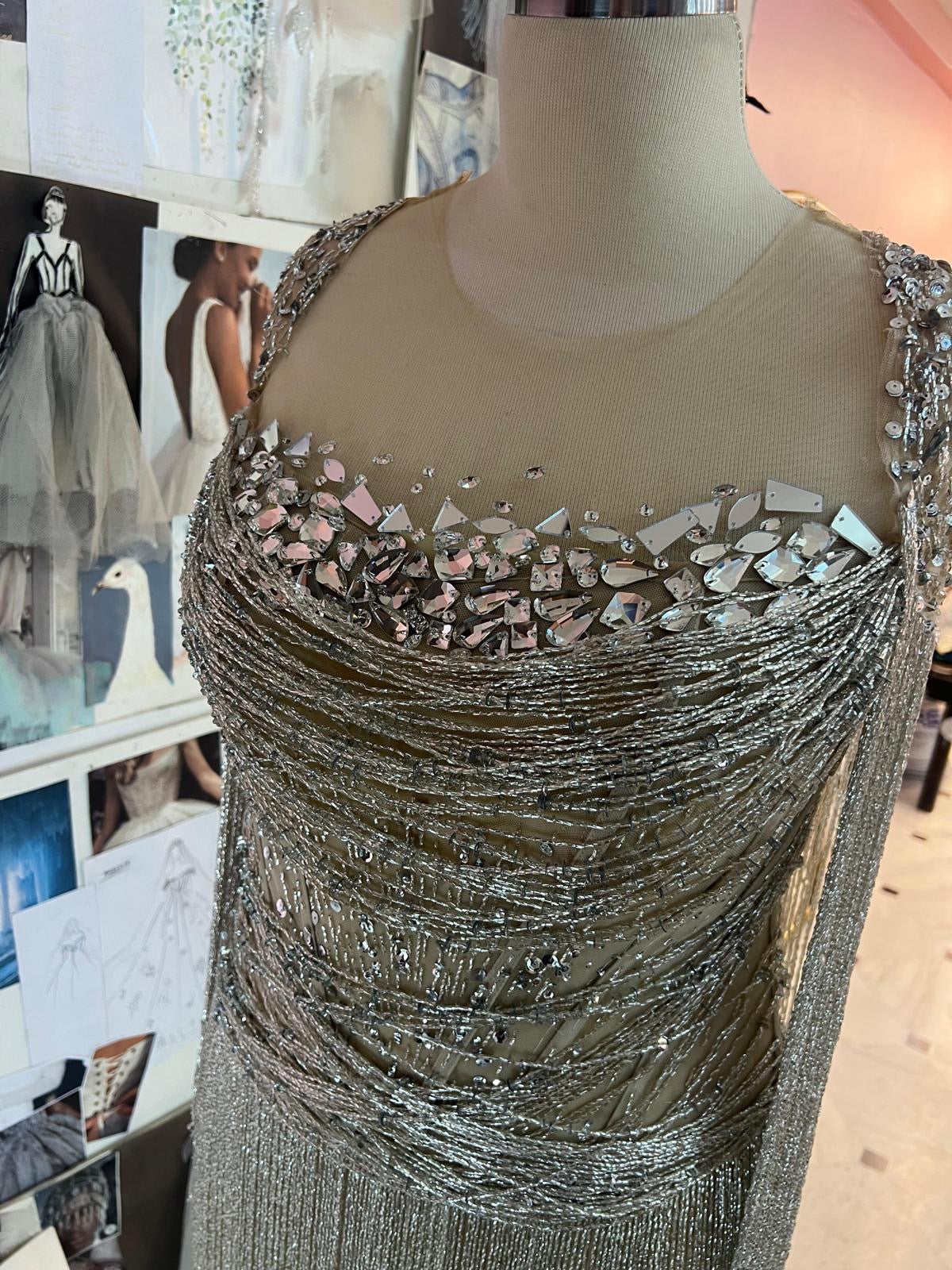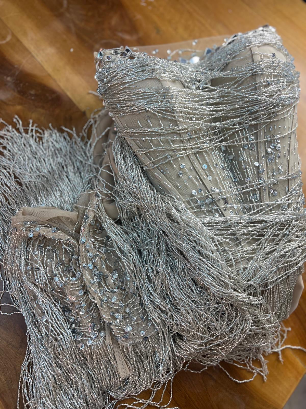 A luxurious handcrafted gown adorned with shimmering white and silver beads, gracefully draping over the body and catching the light with every movement. Delicate fringes cascade from the edges of the dress, adding a sense of flow and elegance, perfect for evening events and special occasions. This design combines sophistication and delicacy, giving your look an enchanting, modern charm.