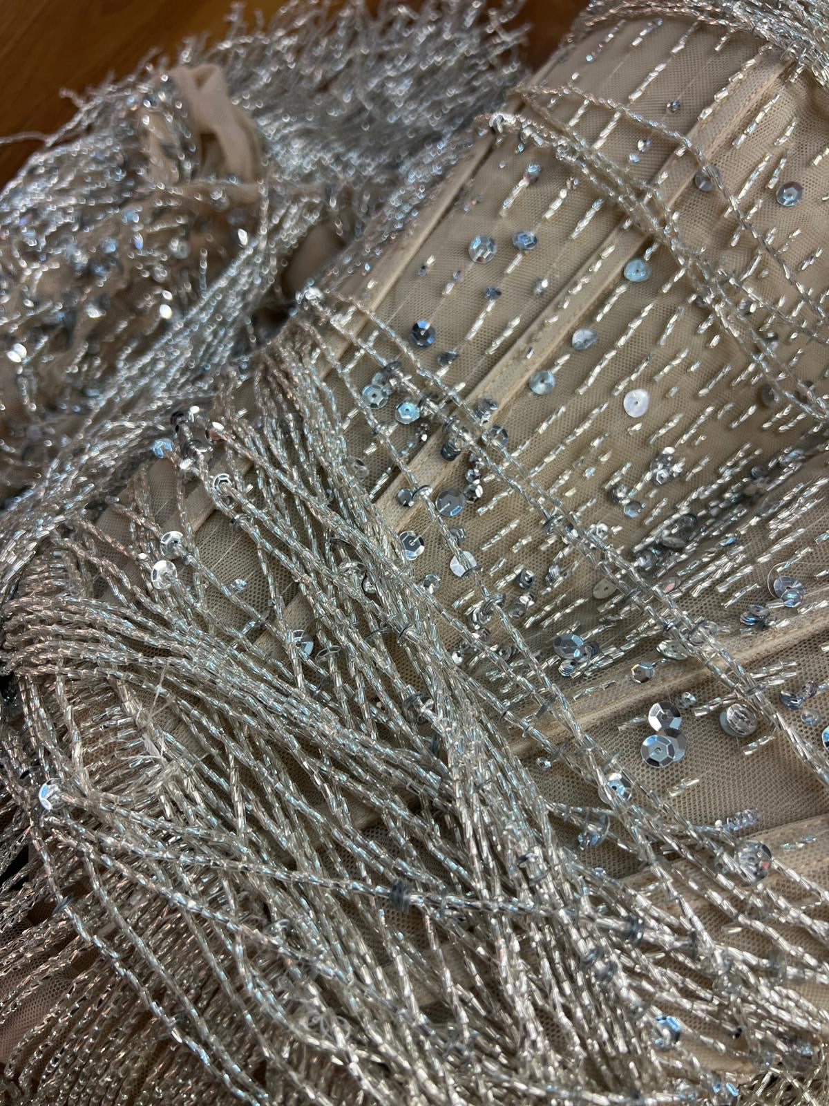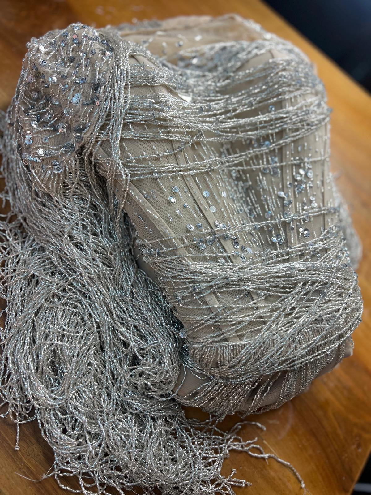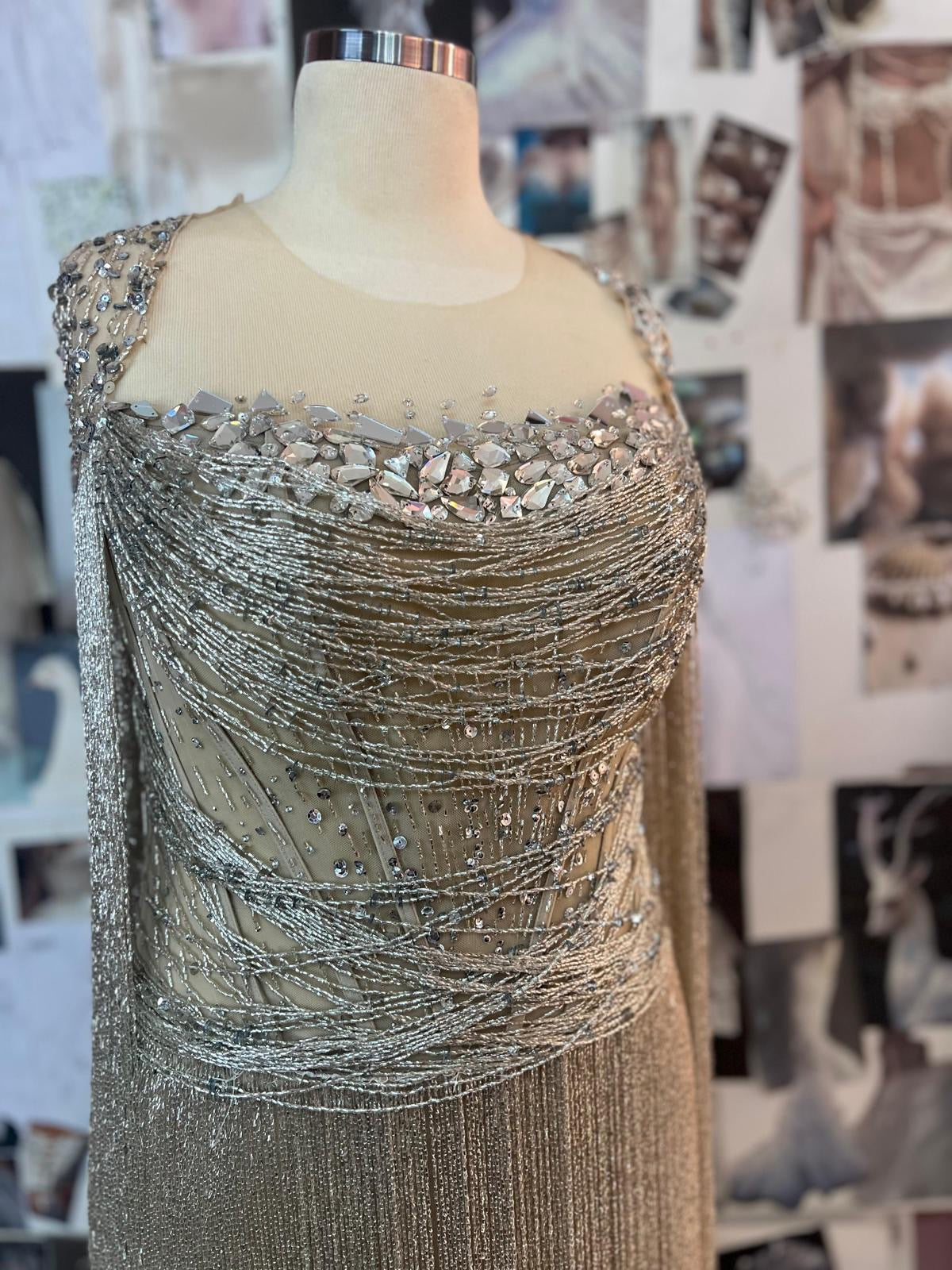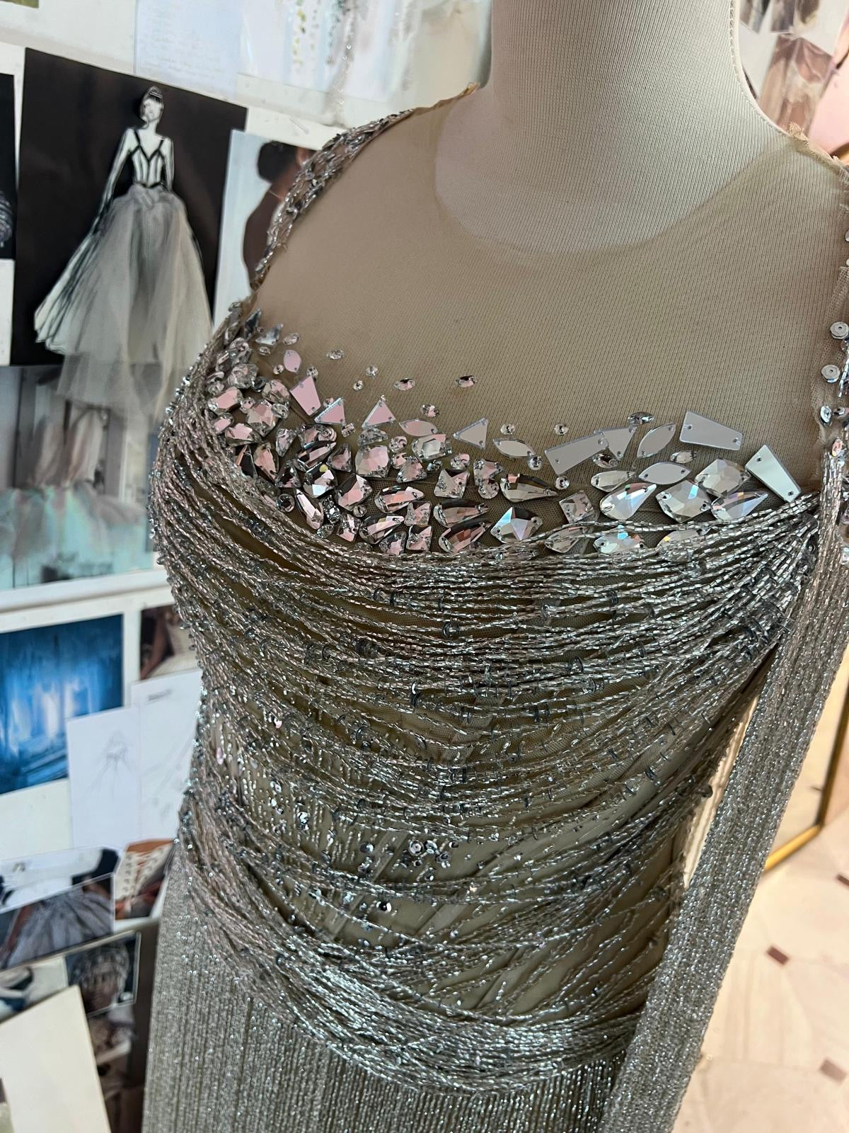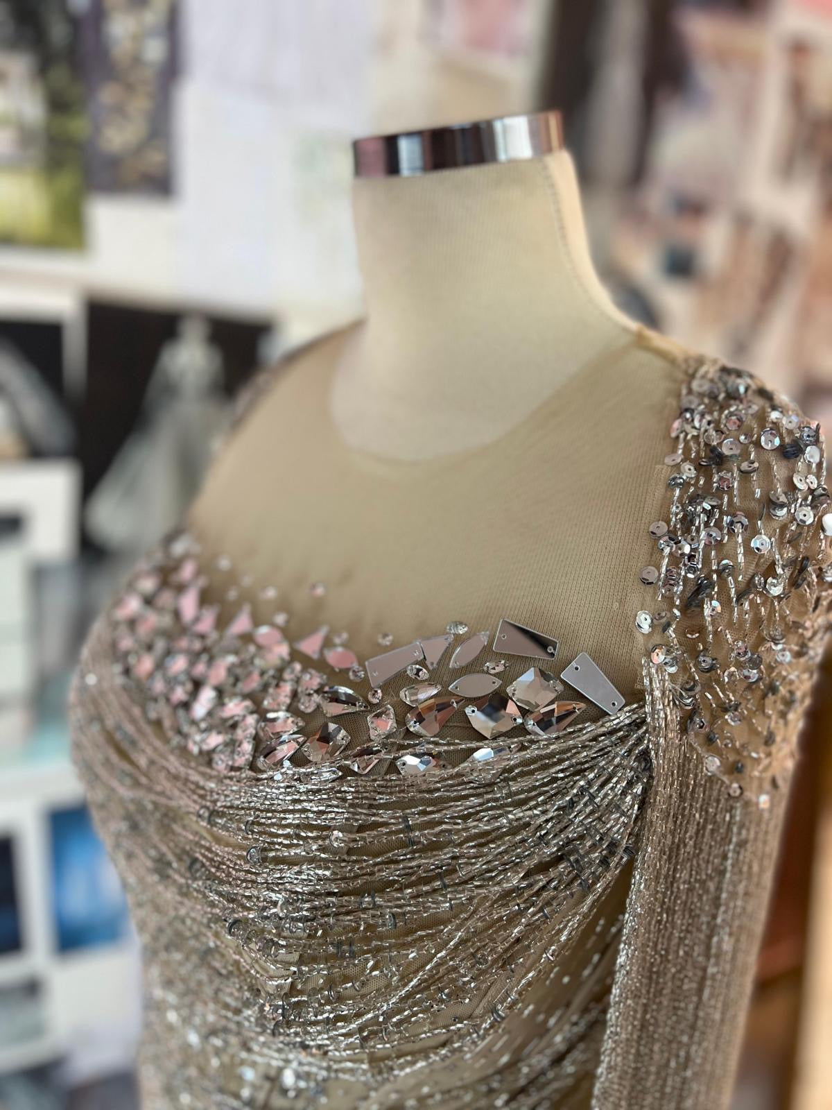 A luxurious handcrafted gown adorned with shimmering white and silver beads, gracefully draping over the body and catching the light with every movement. Delicate fringes cascade from the edges of the dress, adding a sense of flow and elegance, perfect for evening events and special occasions. This design combines sophistication and delicacy, giving your look an enchanting, modern charm.