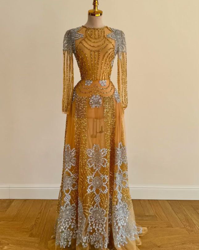 A breathtaking Majestic Gold Couture dress, crafted with the finest materials to create a look of unmatched elegance and sophistication. Adorned with intricate details and a luxurious gold hue, this gown embodies opulence and grace, making it the perfect choice for those seeking a truly royal presence at any exclusive event.”
