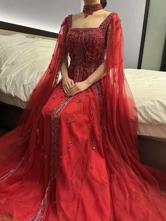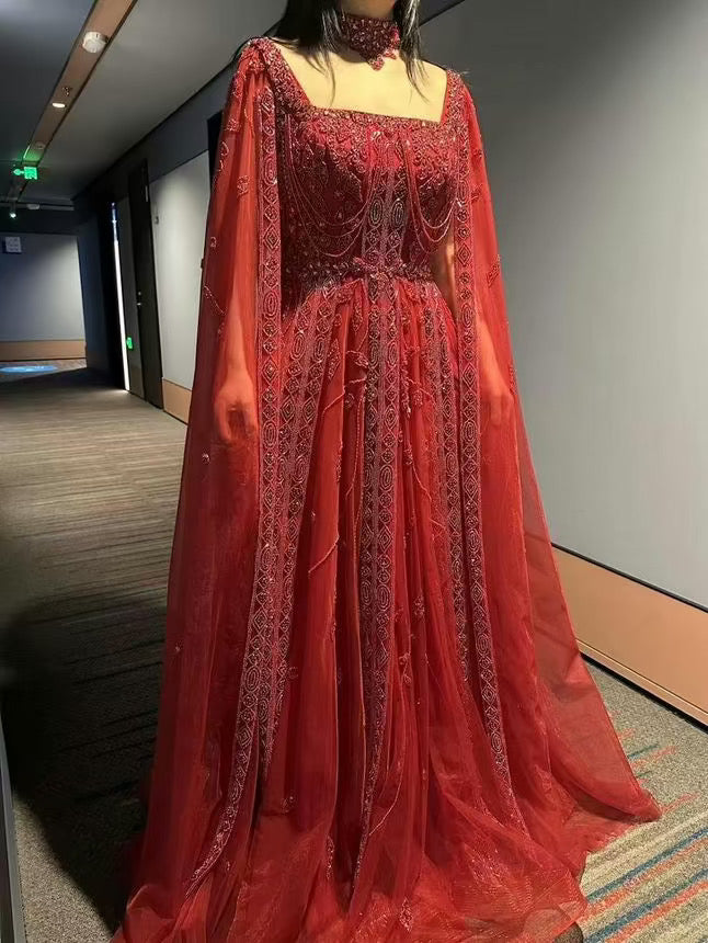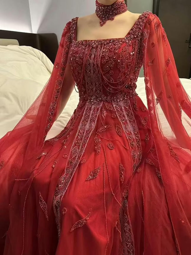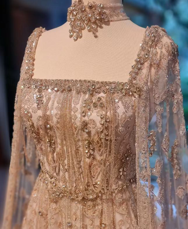 A majestic royal dress that harmonizes with the light, revealing its luxurious and intricate details. Adorned with exquisite crystal embroidery, each crystal reflects the light, creating a soft, captivating shimmer that captures all eyes. The design elegantly enhances the figure, while delicate details of golden threads and rare gemstones embellish the dress. The wide skirt flows gracefully, adding further grandeur and refinement, while the long train extends behind, leaving a trail of majesty and splendor with every step. It is truly the embodiment of royal luxury and limitless wealth.