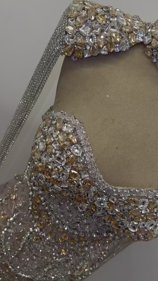 The gown is complemented by an elaborate shoulder piece, worn like a regal accessory. This structured element is heavily embroidered and adds a dramatic flair. From it, fully embroidered threads elegantly descend from the shoulders down the arms to the wrists—flowing like delicate extensions of the gown itself. These are not tassels, but continuous, ornate threads stitched with intention and finesse.