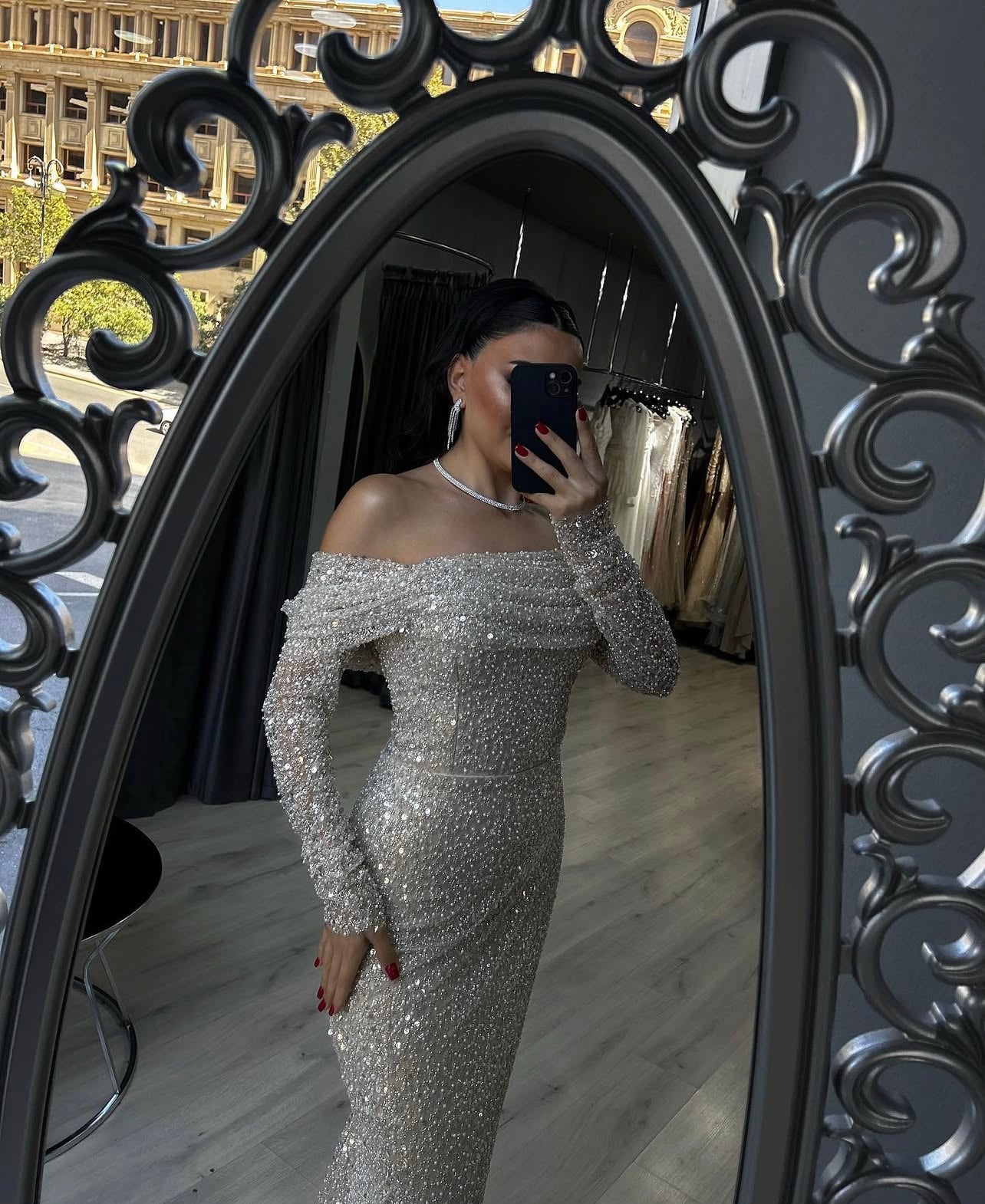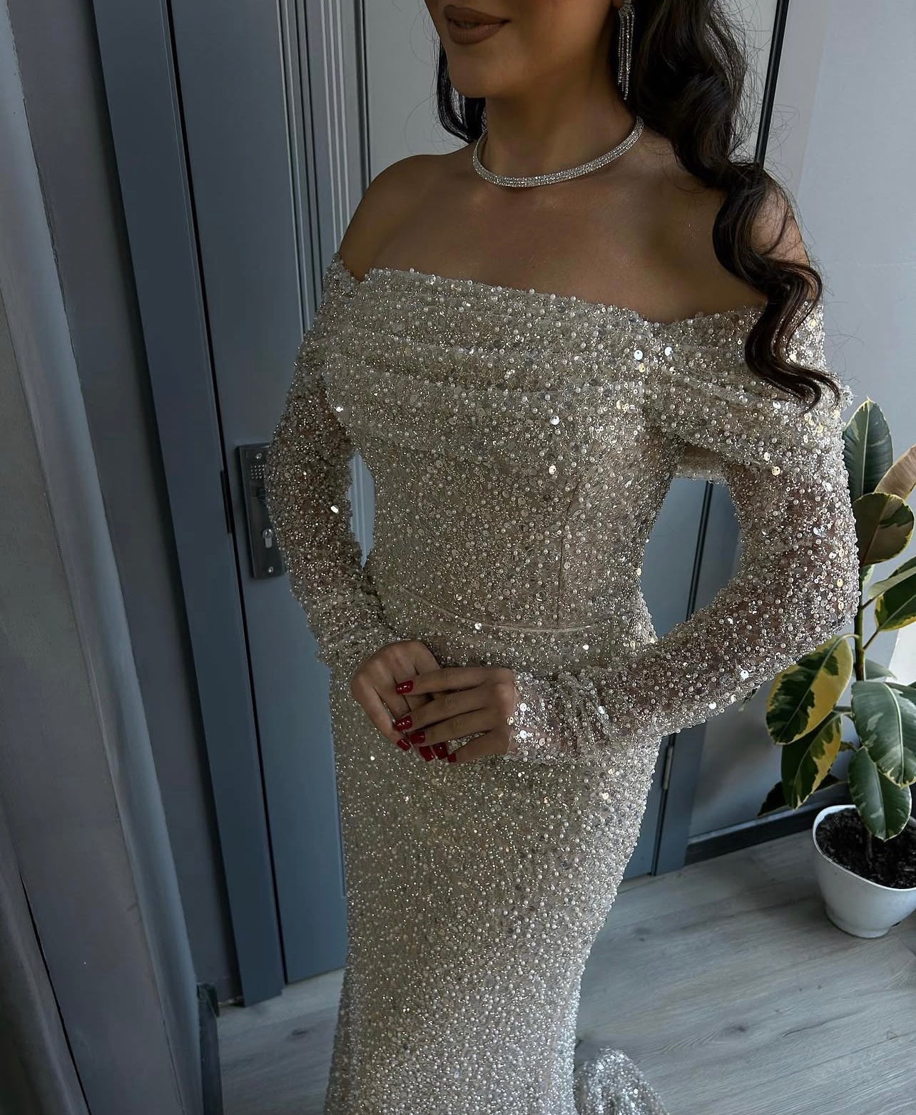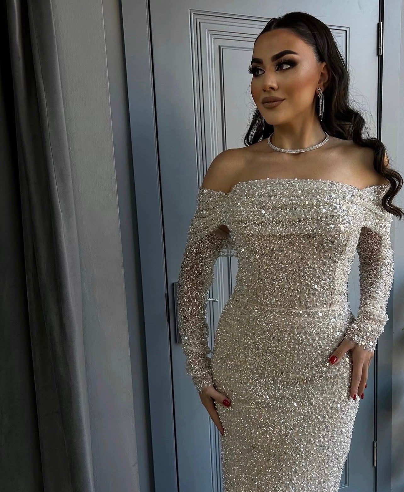 A custom-made dress made entirely of tulle embroidered with pearls.