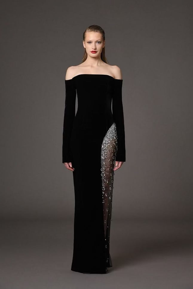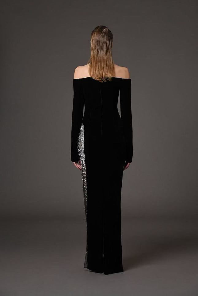 The long sleeves add a touch of classic glamour, while a high side slit that extends along the leg introduces a subtle yet captivating allure. The slit is beautifully adorned with delicate embroidery, adding a luxurious and artistic detail to the flowing silhouette.