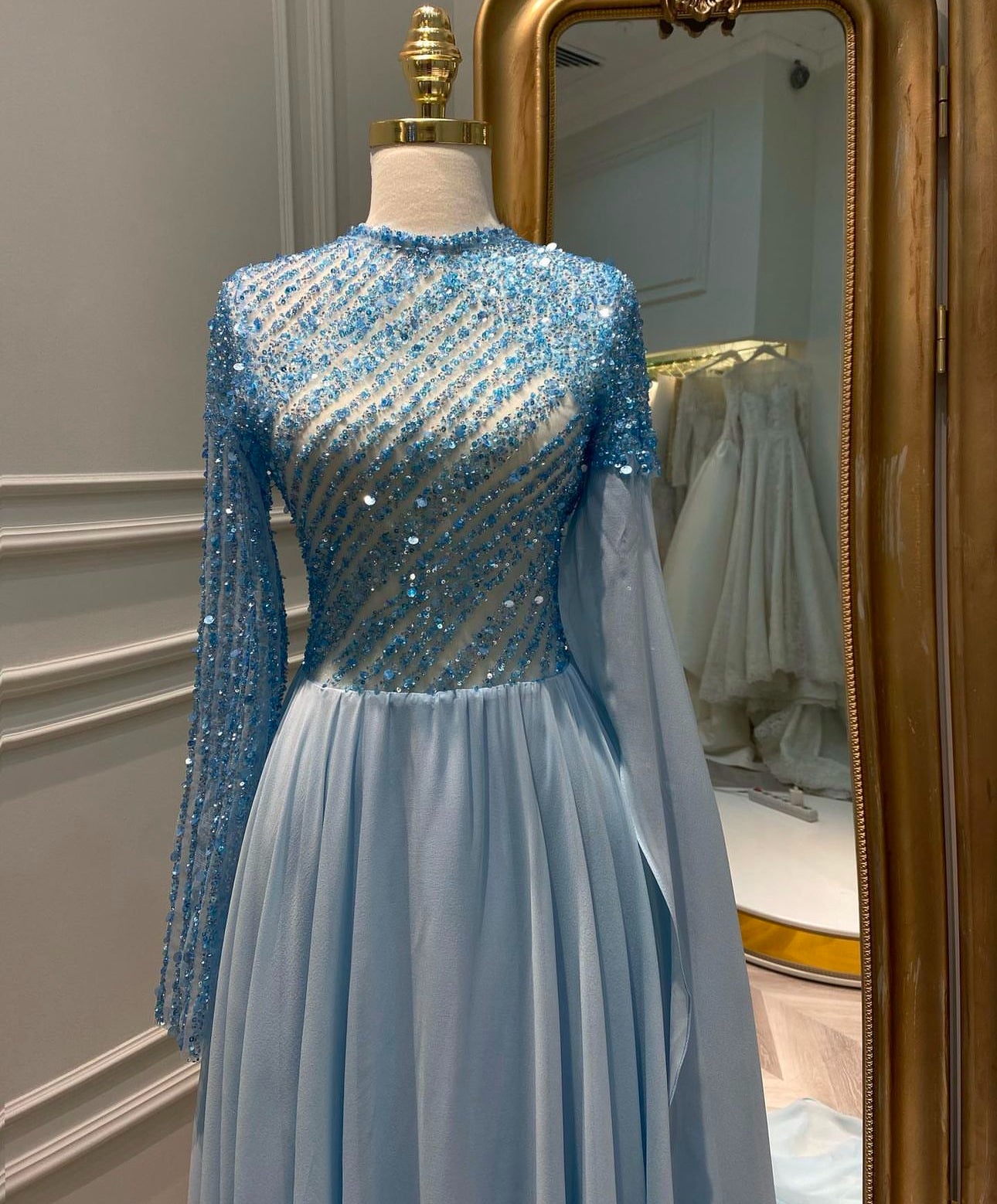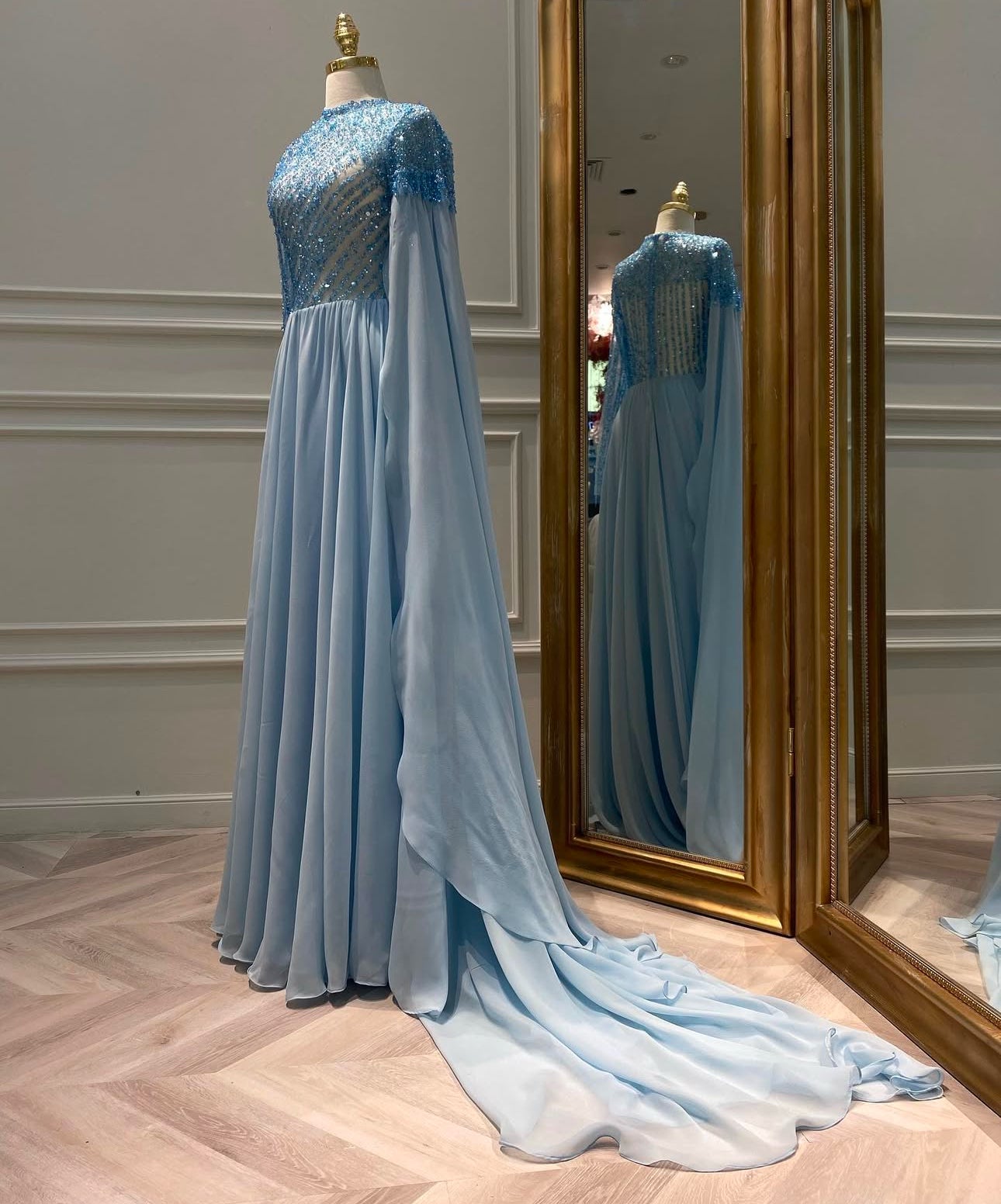 A custom-made double flared chiffon dress with embroidery on top made of tulle, and the type of embroidery includes beads and crystal stones.