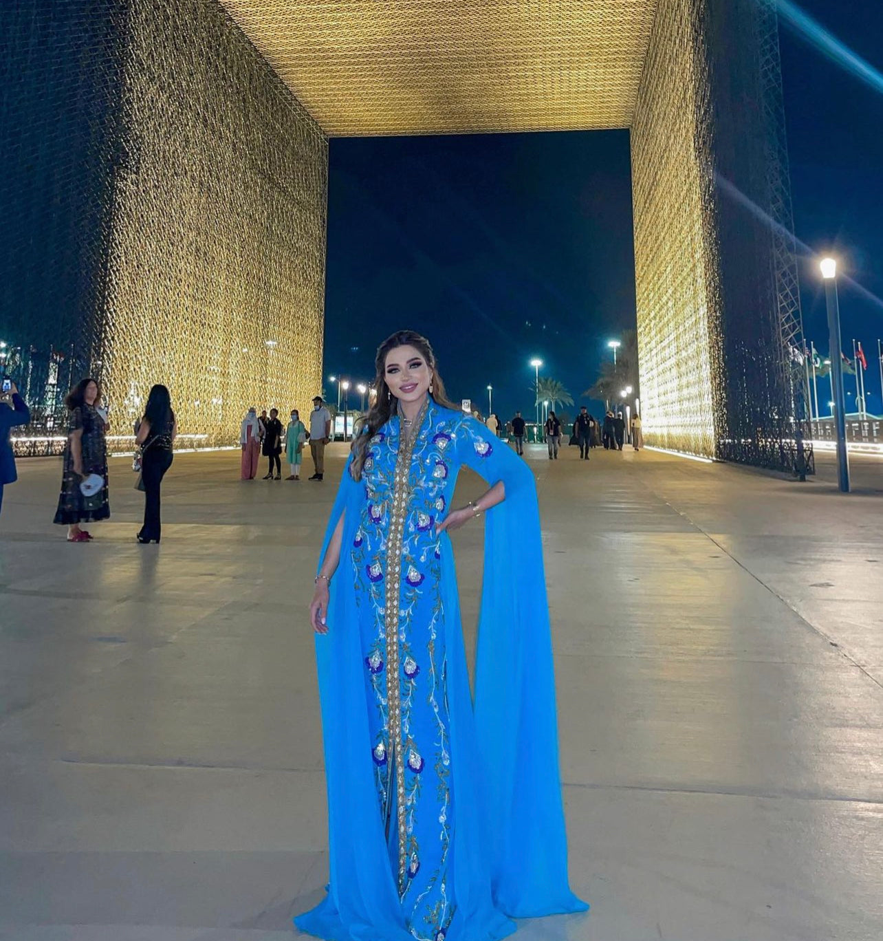 A bridal caftan custom-made from chiffon fabric, hand-embroidered with crystals, beads, and sequins in a harmonious and eye-catching manner.