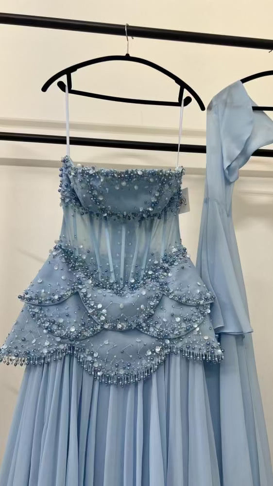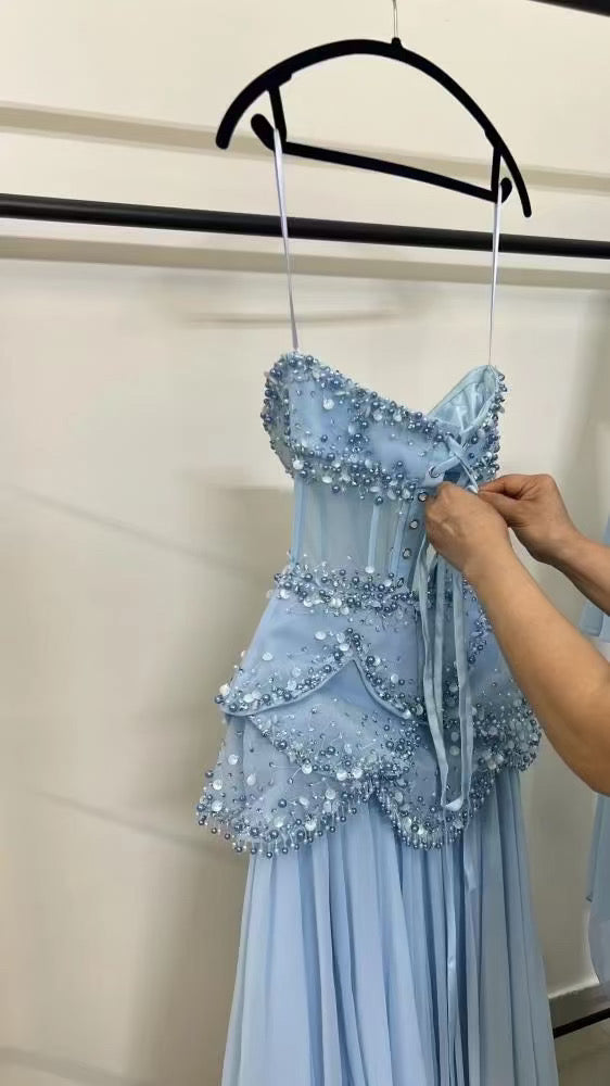 A stunning long sky-blue gown that captivates with its elegance and charm. Crafted from soft, flowing fabric that drapes gracefully over the body, the dress features a beautifully structured corset bodice that accentuates the waist and adds a touch of timeless femininity.