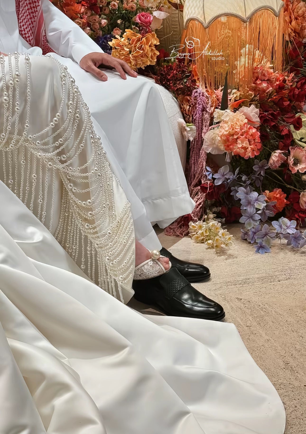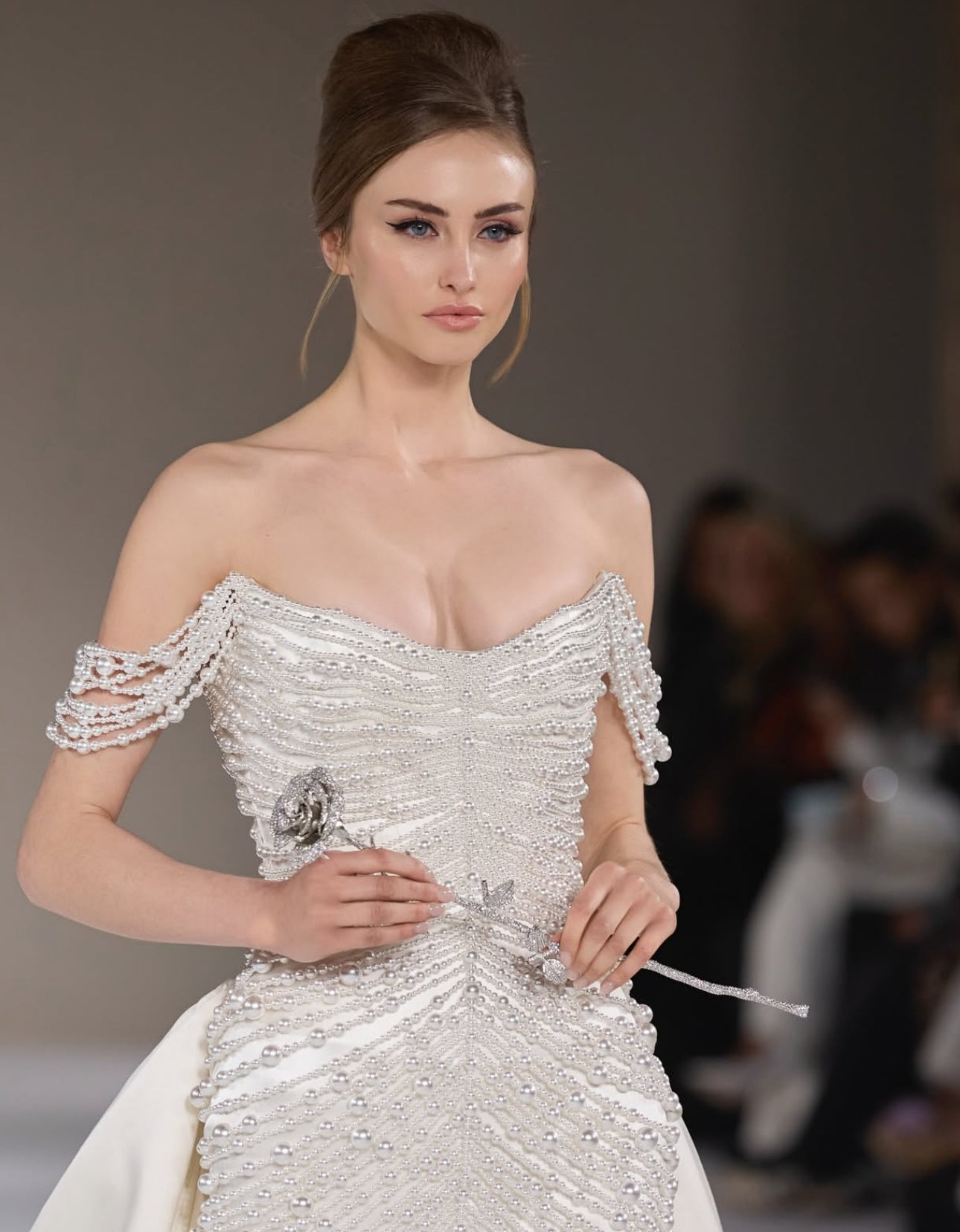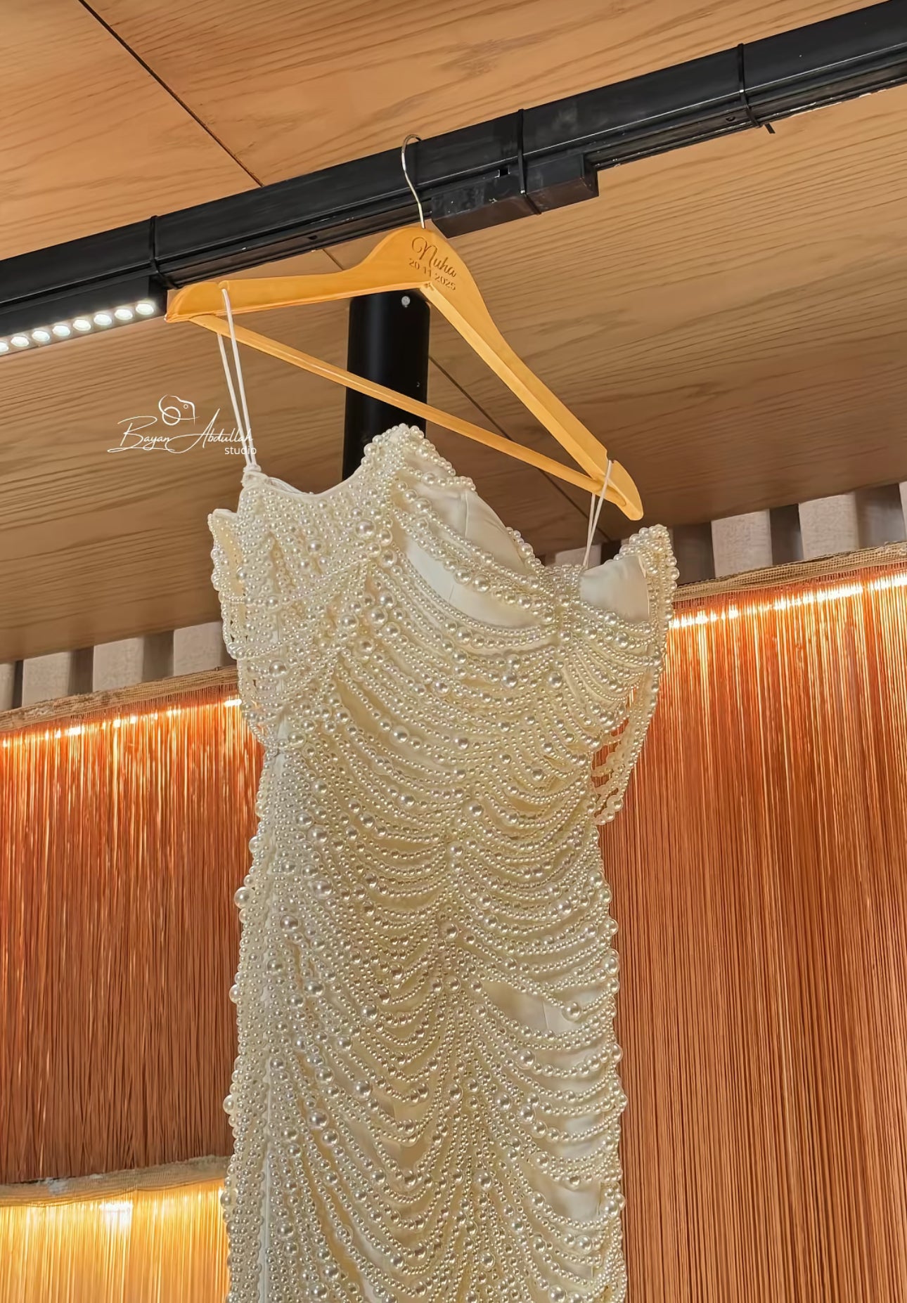 A fully custom-made gown, hand-embellished with delicate pearls and lined with soft satin for a luxurious, smooth finish. Designed to contour your silhouette with elegance, this piece reflects timeless craftsmanship and a refined feminine touch.