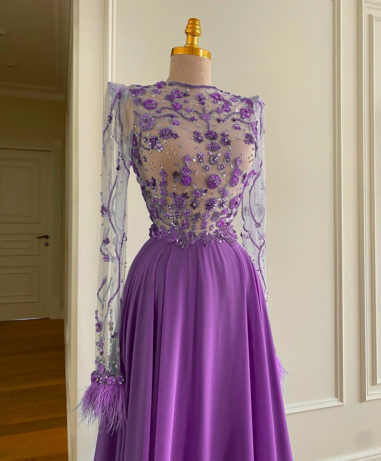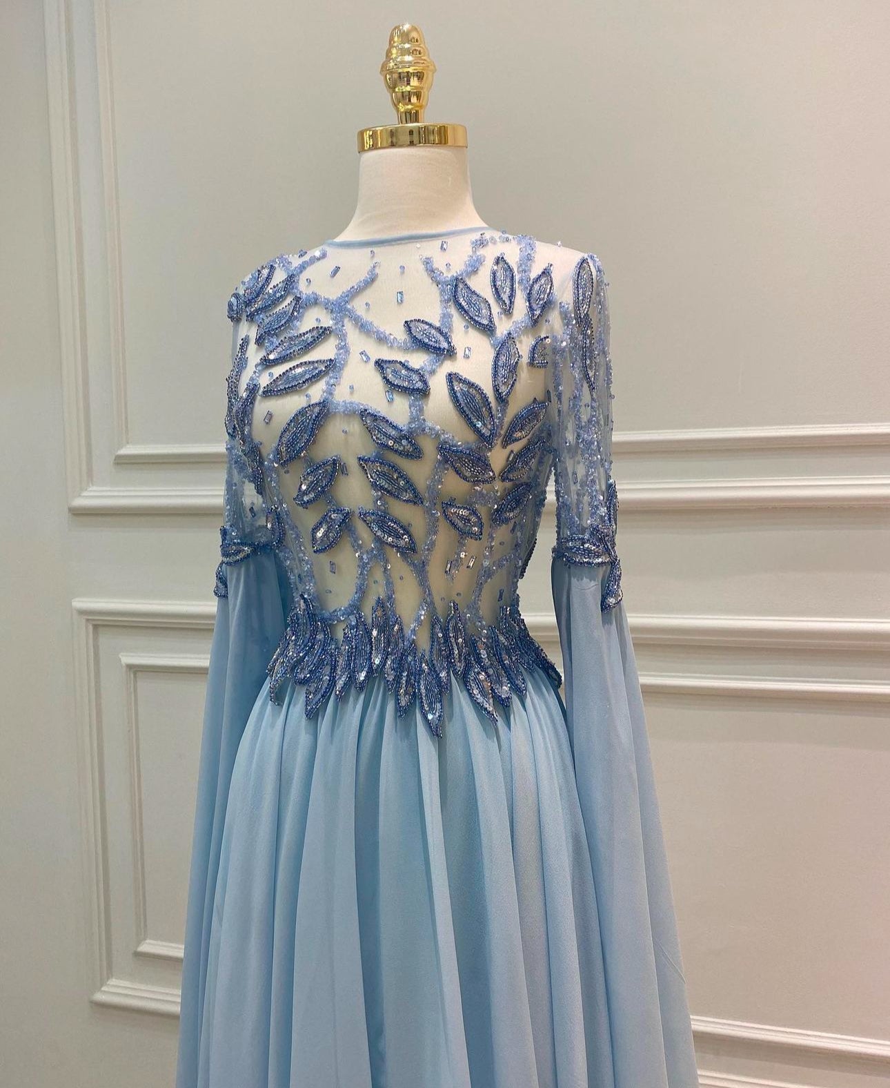 A custom-made double flared chiffon dress with embroidery on top made of tulle, and the type of embroidery includes beads and crystal stones.