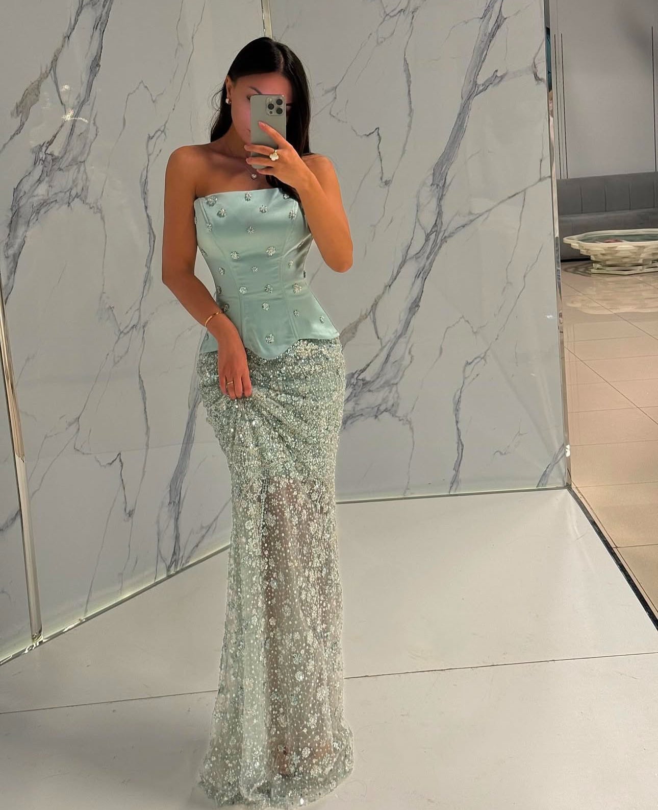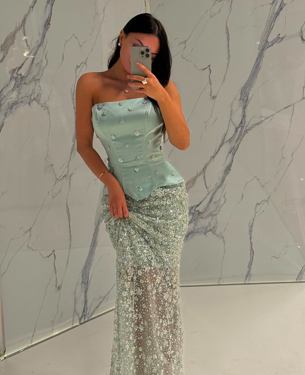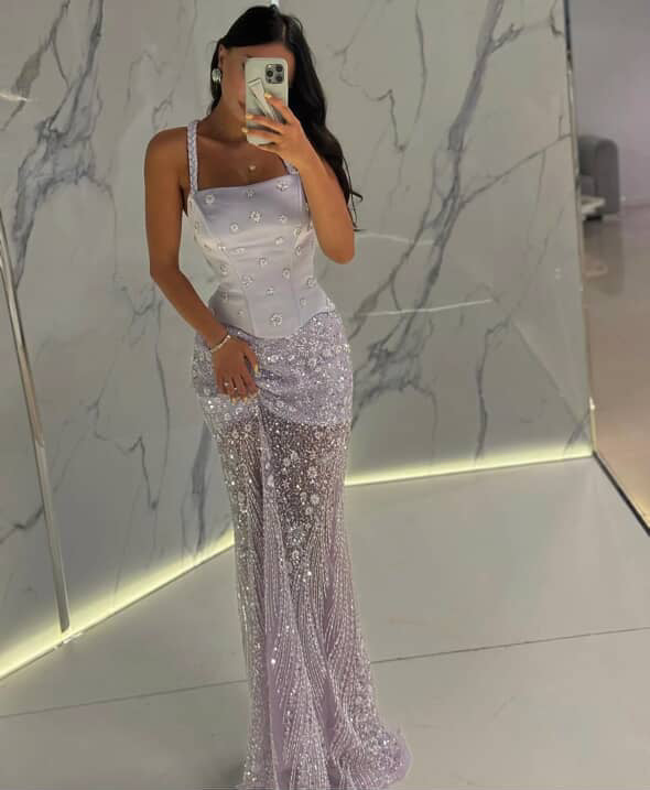 A custom-made dress from soft tulle, hand-embroidered with beads and crystals.