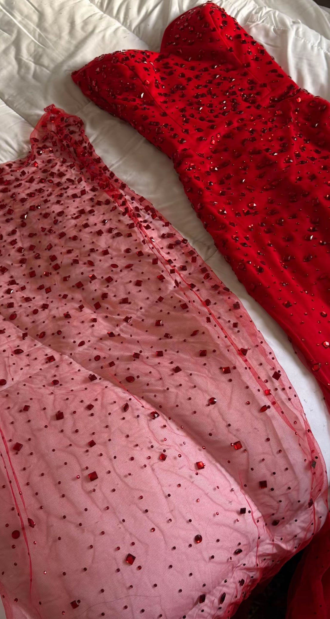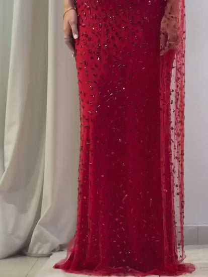 The dress is fully embellished with red crystal embroidery, catching the light with every movement and adding a touch of regal glamour.