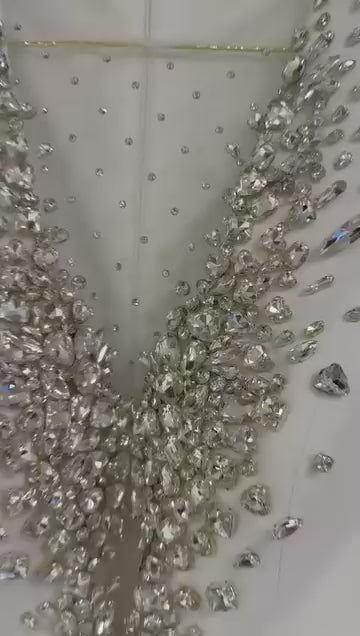 “A regal white dress adorned with sparkling zircon stones, exuding unparalleled luxury and elegance. Its royal design combines intricate details and refined craftsmanship, creating an extraordinary shine. This dress is the perfect choice for special occasions that call for a majestic and unforgettable presence.”
