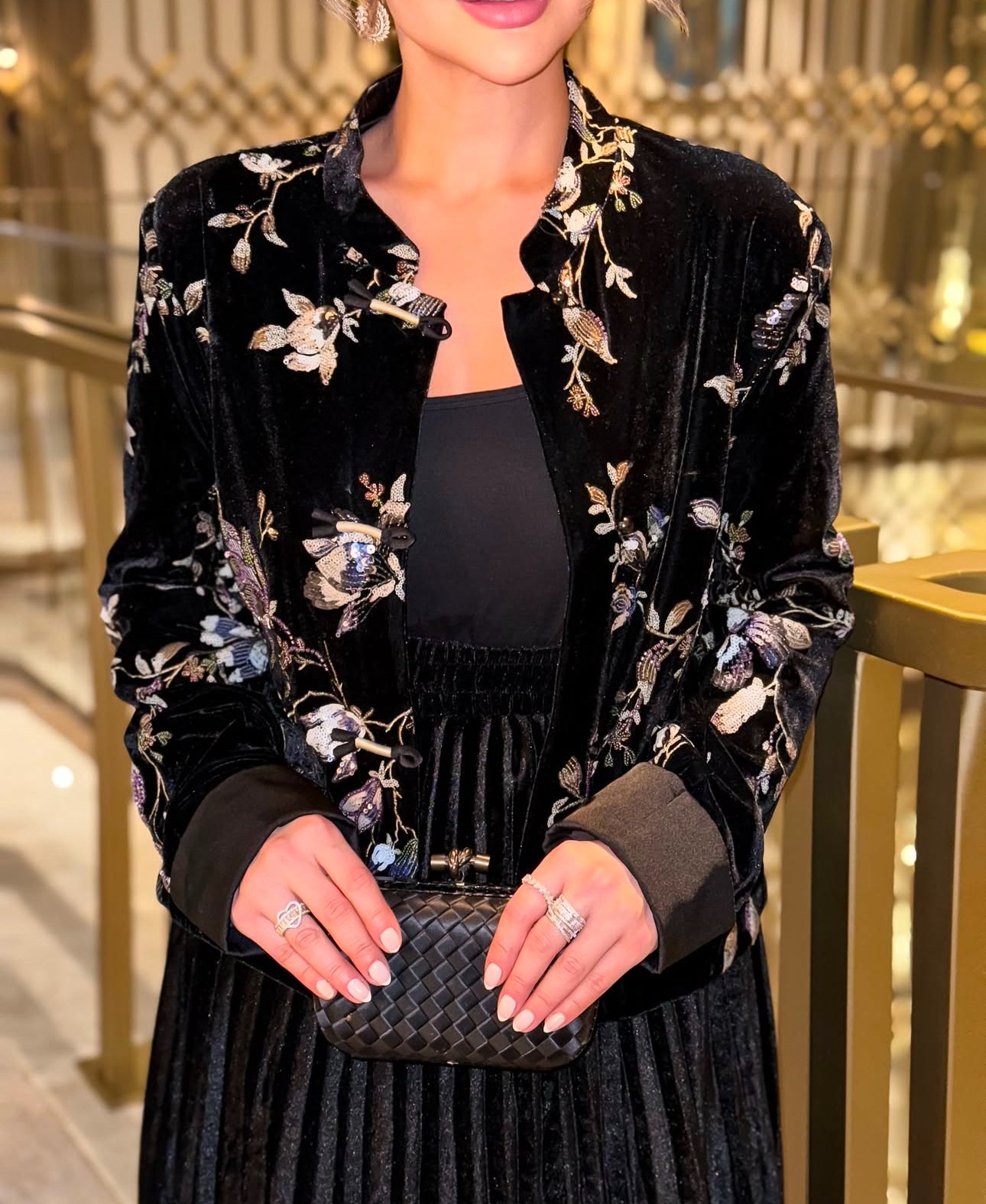 A velvet embroidered jacket set with fine beadwork and a velvet skirt.