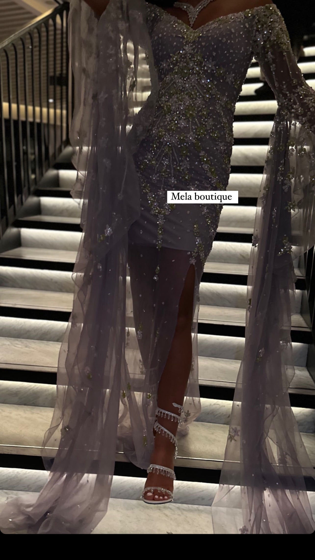 A custom-made dress with long sleeves, fully embroidered with crystals and beads, made of tulle fabric