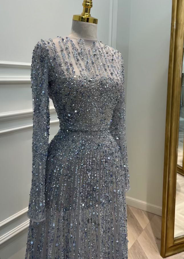 “A stunning heavy long-sleeve dress adorned with shimmering crystals from head to toe, creating a breathtaking sparkle with every movement. The intricate crystal detailing elevates the design, adding an aura of sophistication and glamour. Perfect for formal events or special occasions, this dress exudes opulence and a regal presence, making it the ultimate statement piece.”