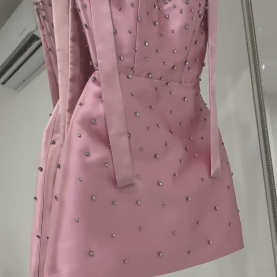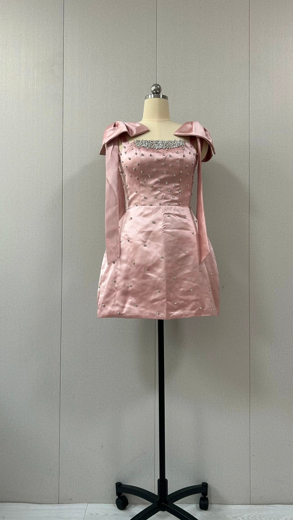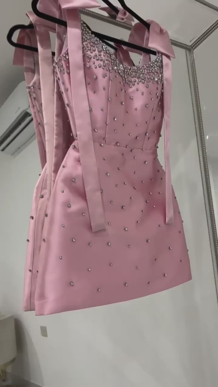 A custom-made dress made of taffeta fabric with an added bow and hand-embroidered with crystal beads