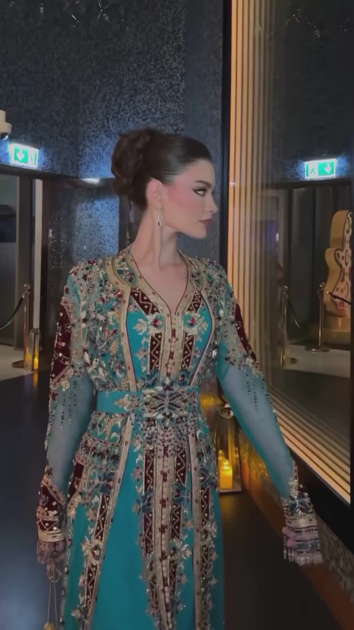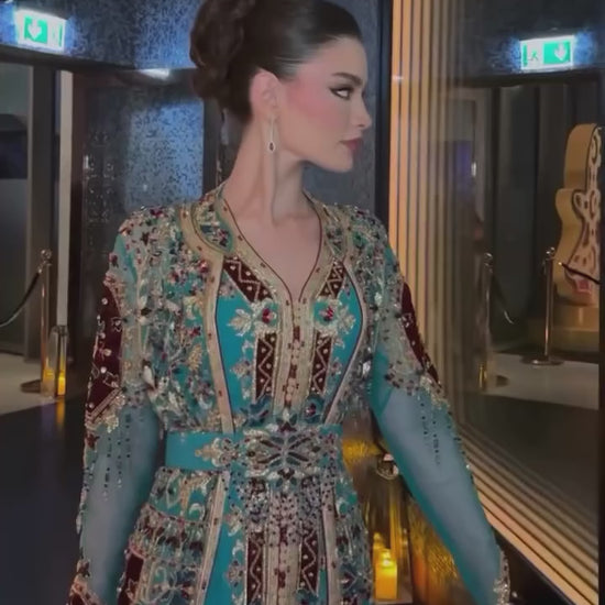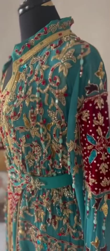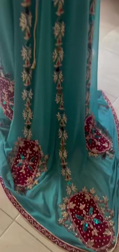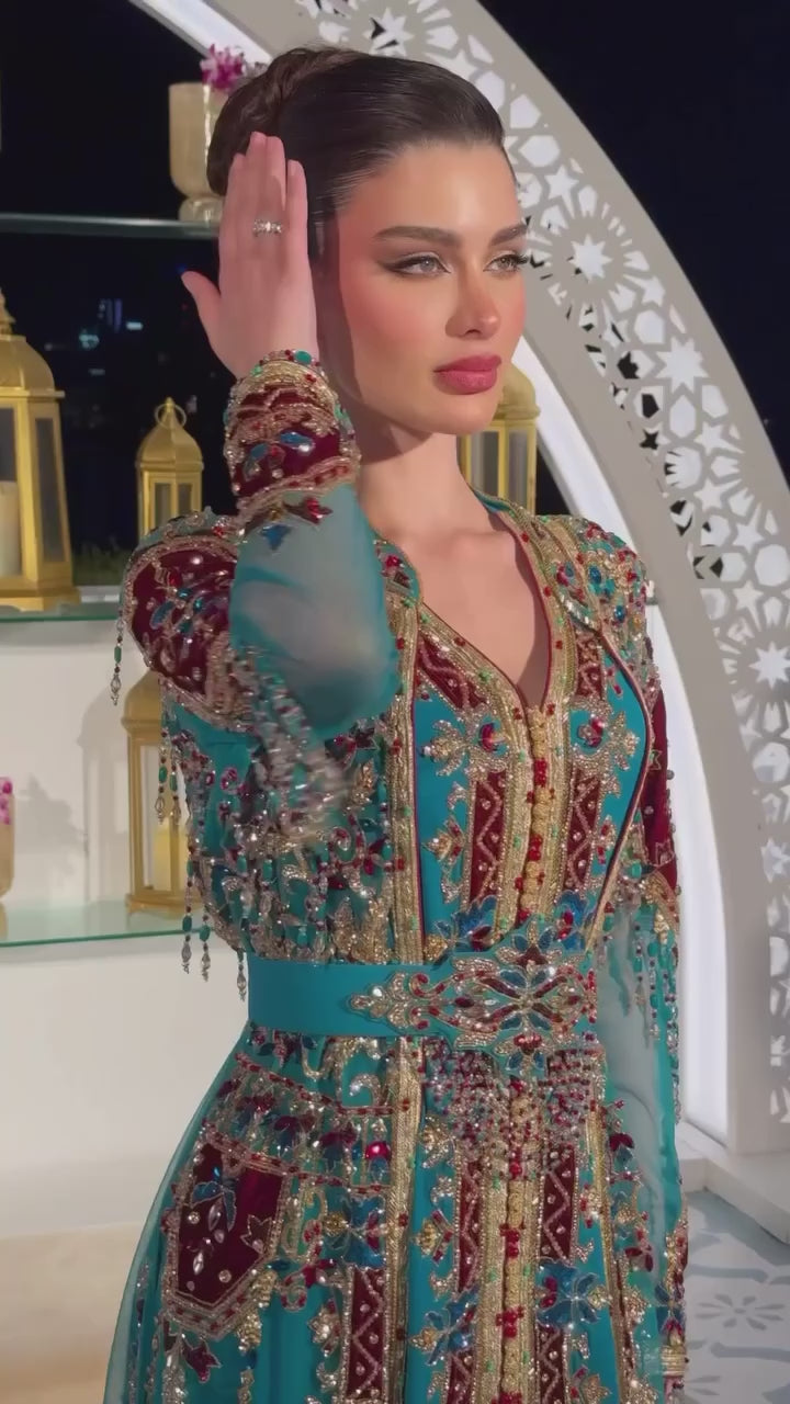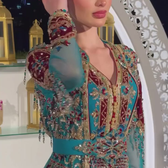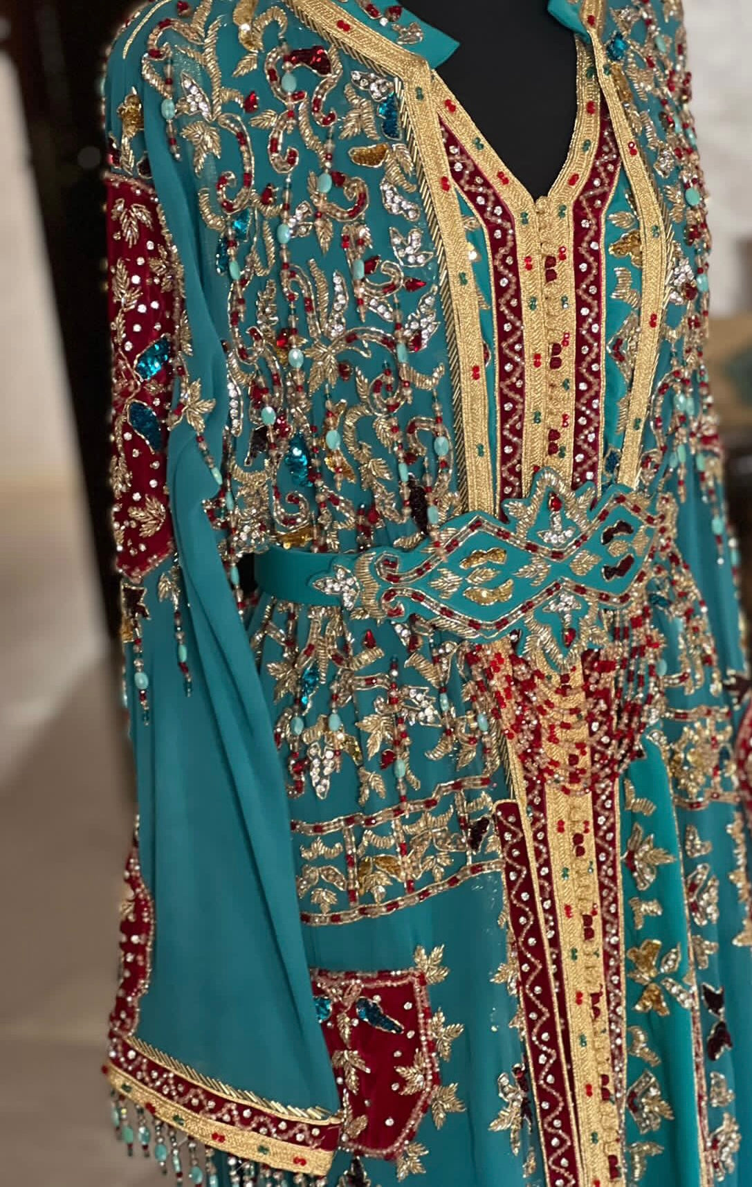 A custom-made royal caftan, expertly crafted from the finest crystal beads and fully hand-embroidered from front to back, with added maroon velvet