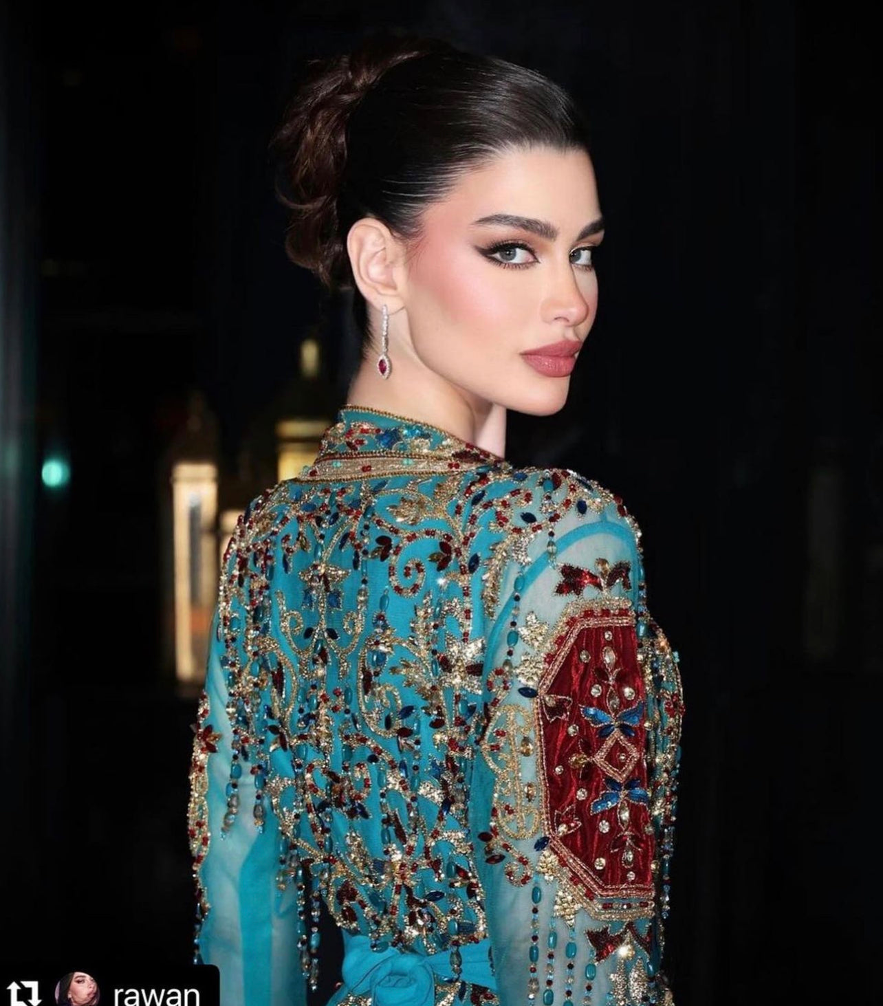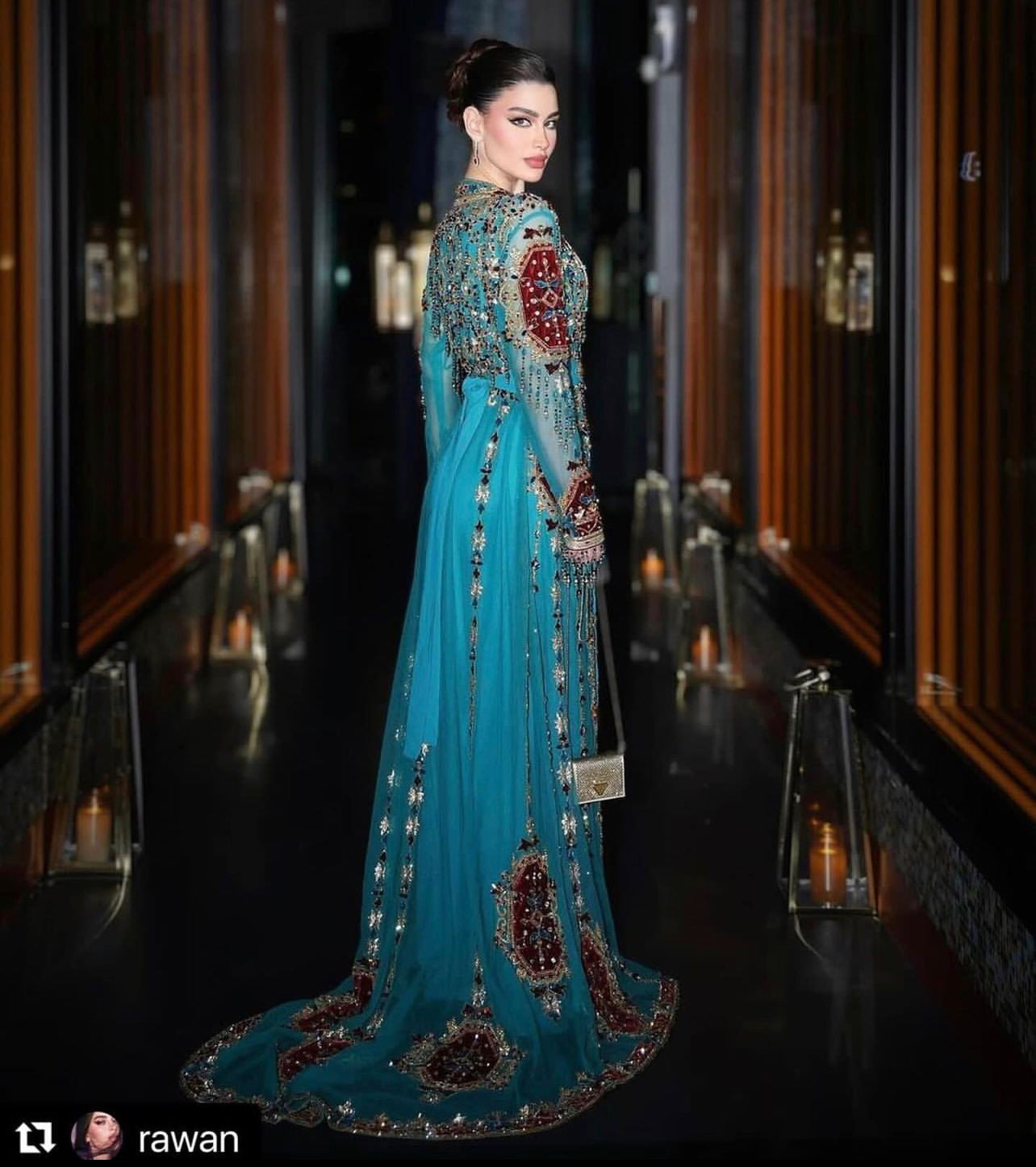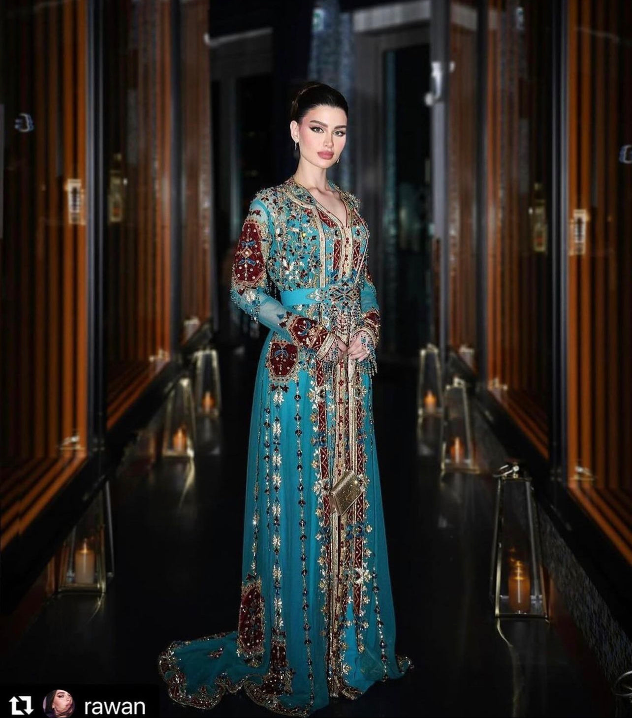 A custom-made royal caftan, expertly crafted from the finest crystal beads and fully hand-embroidered from front to back, with added maroon velvet